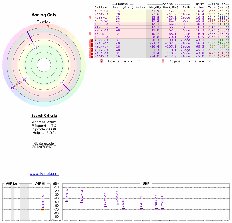 Here are the results for your location. The transmitter database was last updated on June 7, 2013. For more information about these plots and how to interpret them, please check out the Signal Analysis FAQ.