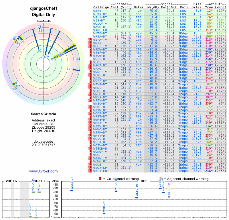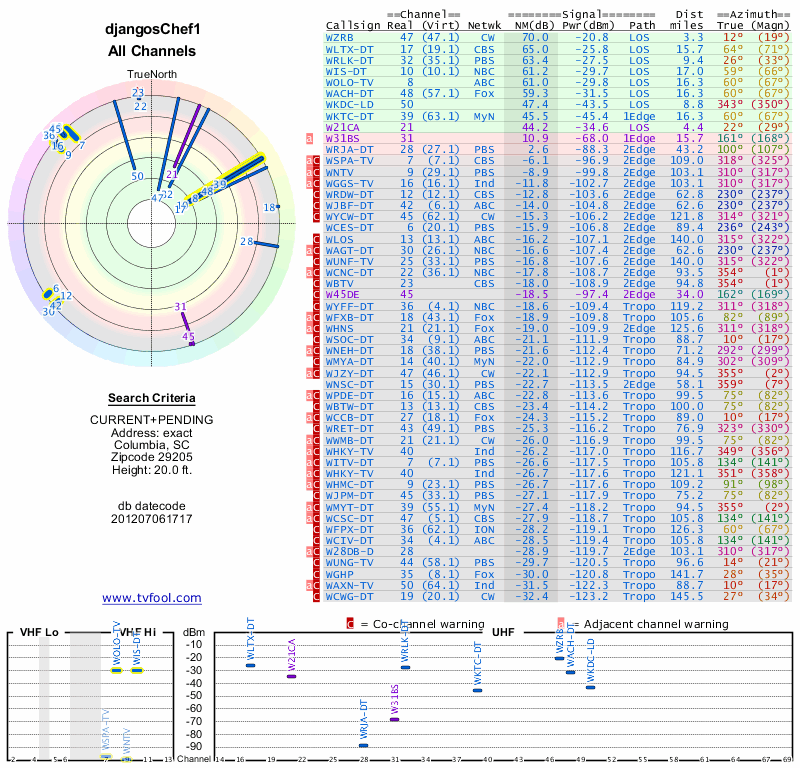 Here are the results for your location. The transmitter database was last updated on June 7, 2013. For more information about these plots and how to interpret them, please check out the Signal Analysis FAQ.