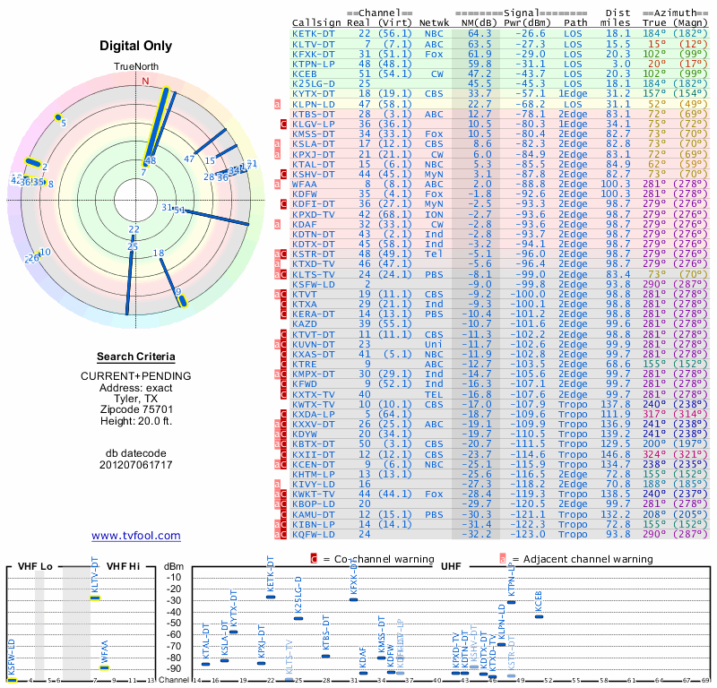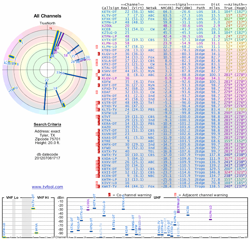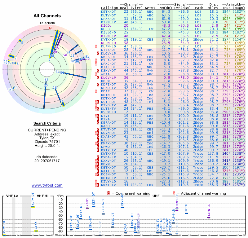 Here are the results for your location. The transmitter database was last updated on June 7, 2013. For more information about these plots and how to interpret them, please check out the Signal Analysis FAQ.