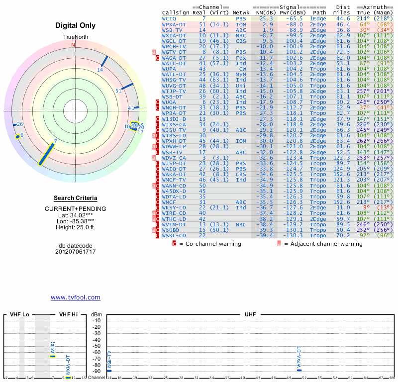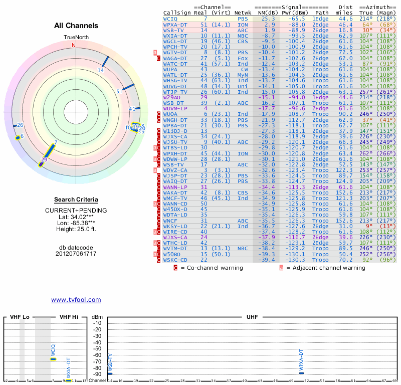 Here are the results for your location. The transmitter database was last updated on June 7, 2013. For more information about these plots and how to interpret them, please check out the Signal Analysis FAQ.