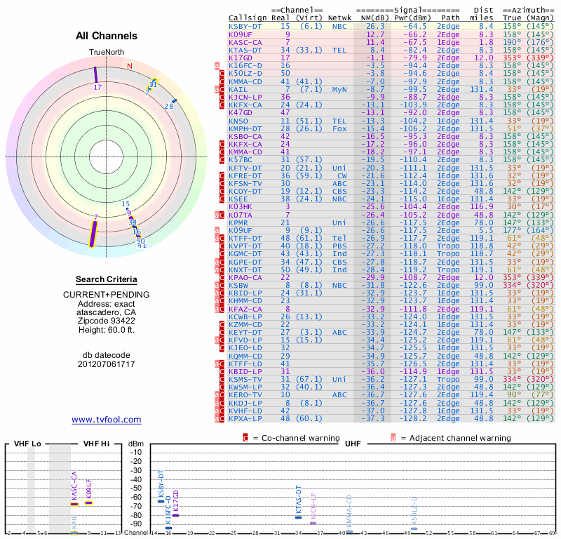 Here are the results for your location. The transmitter database was last updated on June 7, 2013. For more information about these plots and how to interpret them, please check out the Signal Analysis FAQ.