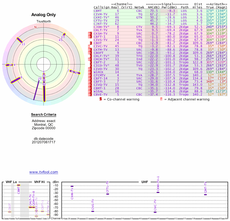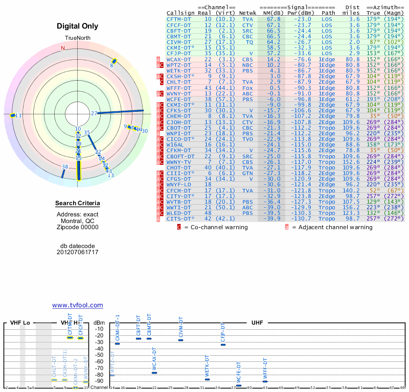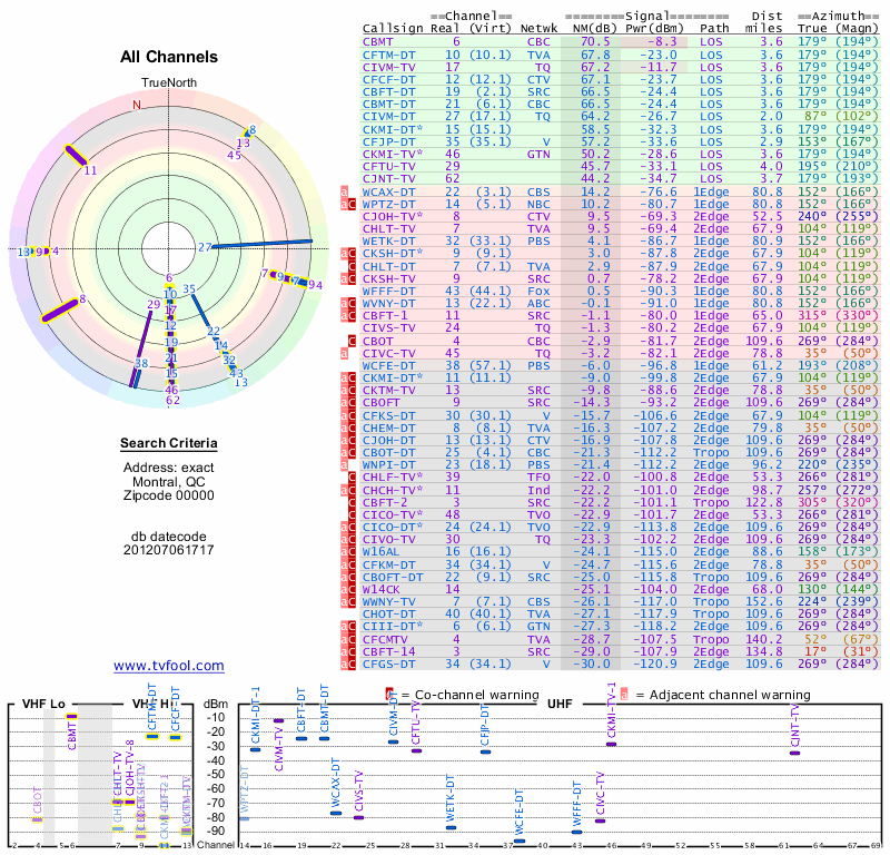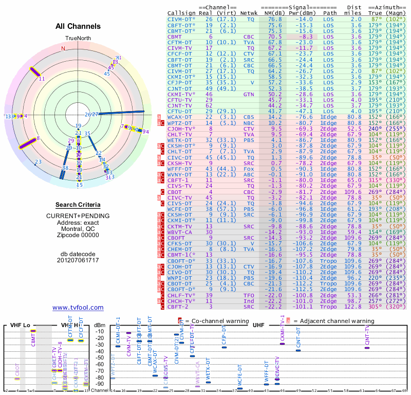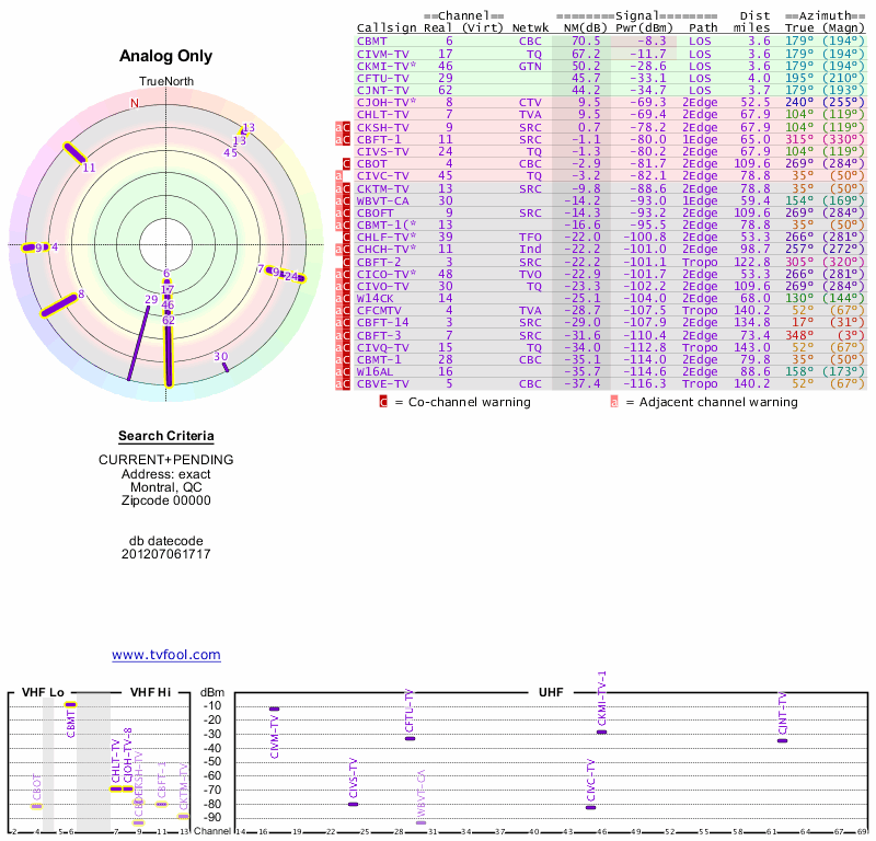 Here are the results for your location. The transmitter database was last updated on June 7, 2013. For more information about these plots and how to interpret them, please check out the Signal Analysis FAQ.