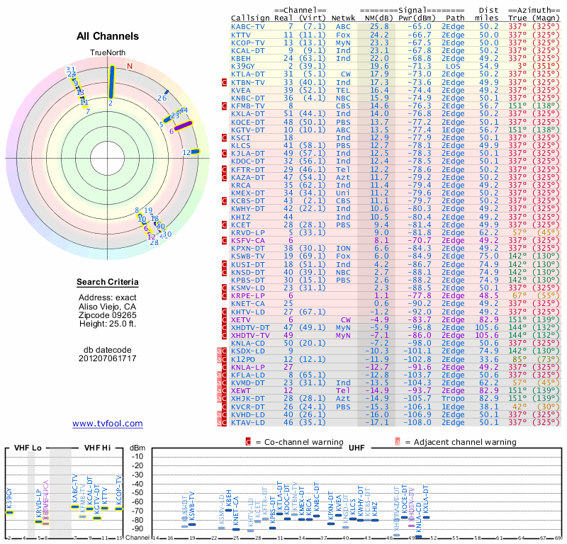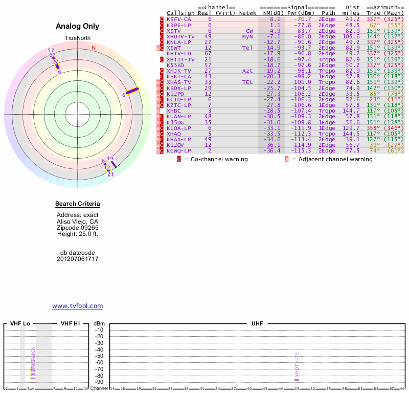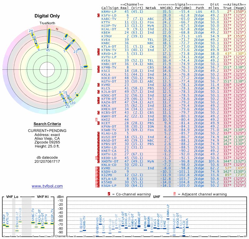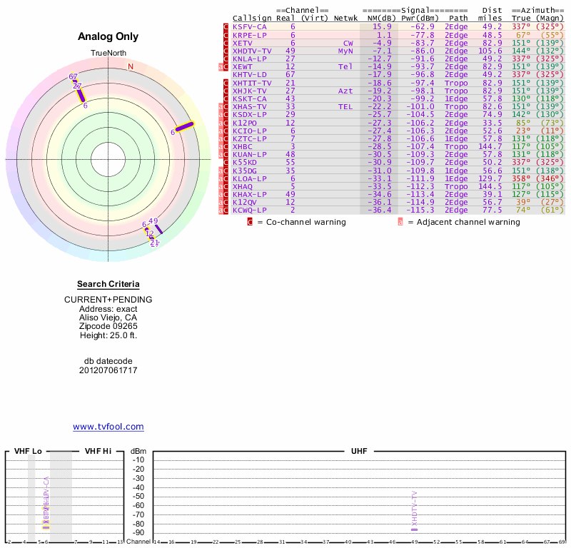 Here are the results for your location. The transmitter database was last updated on June 7, 2013. For more information about these plots and how to interpret them, please check out the Signal Analysis FAQ.
