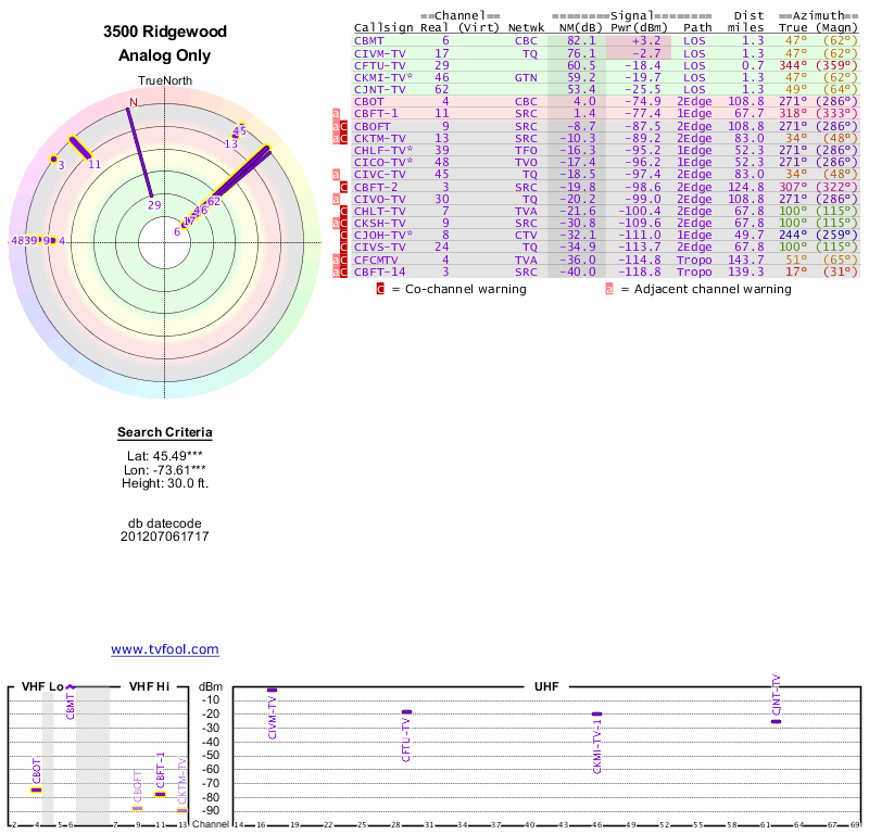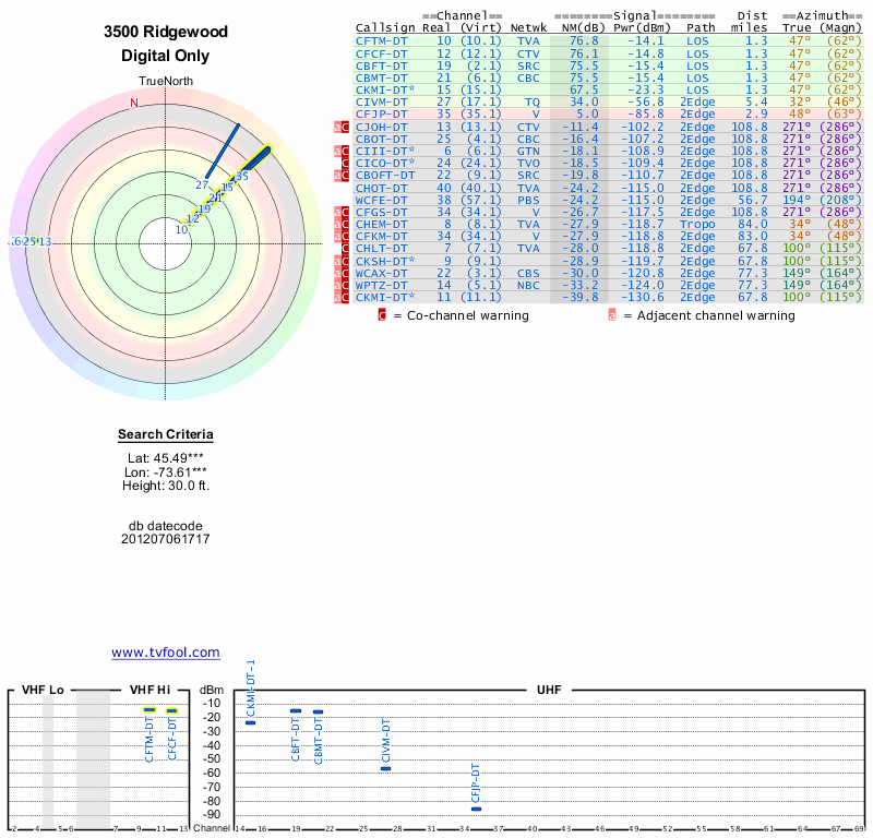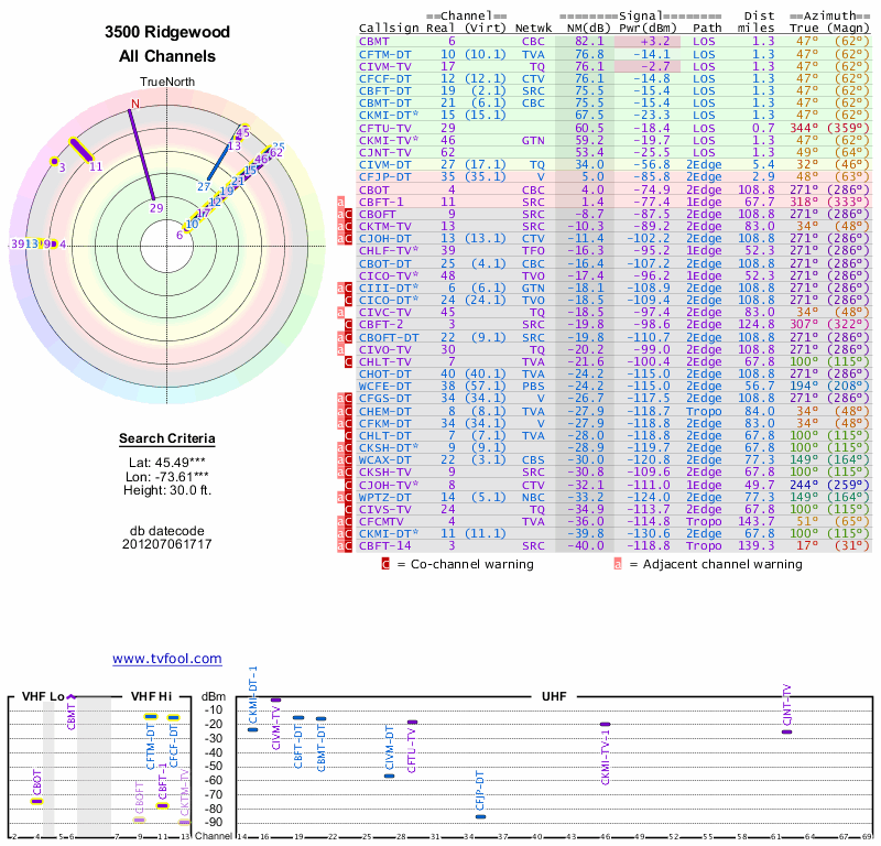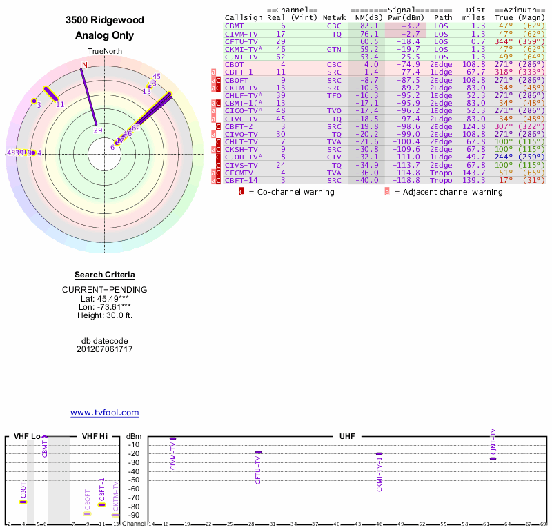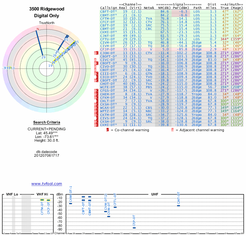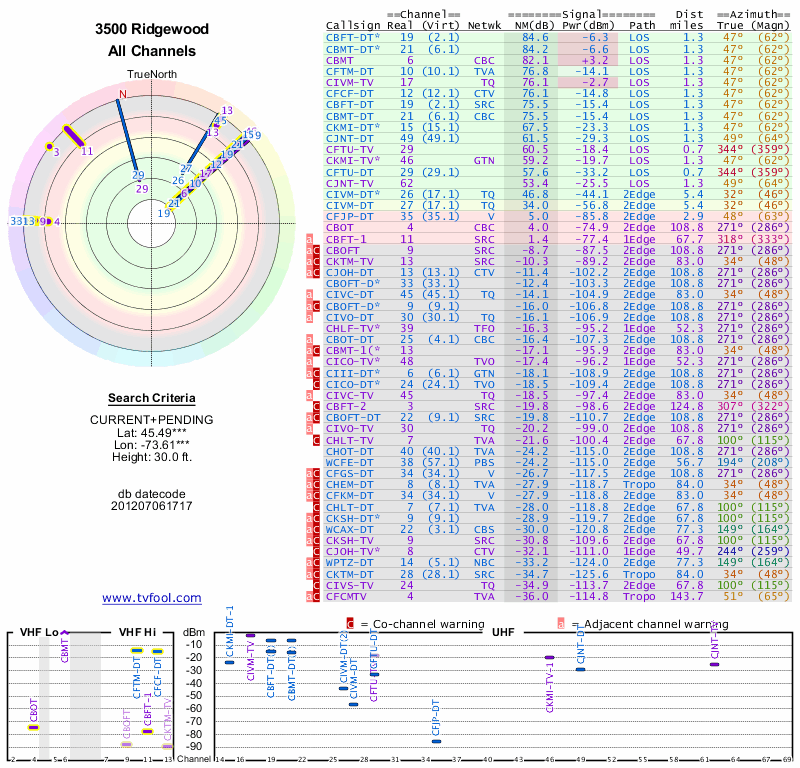 Here are the results for your location. The transmitter database was last updated on June 7, 2013. For more information about these plots and how to interpret them, please check out the Signal Analysis FAQ.