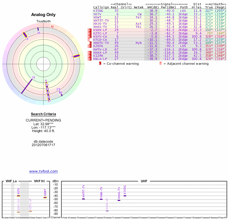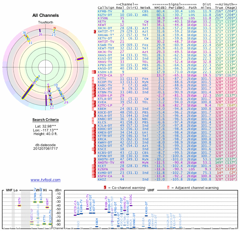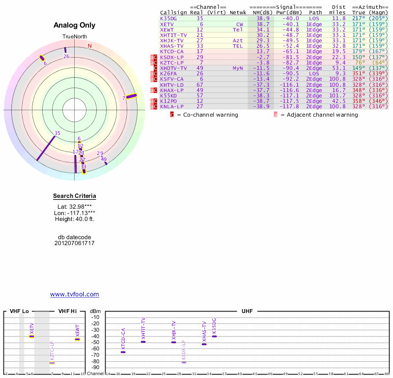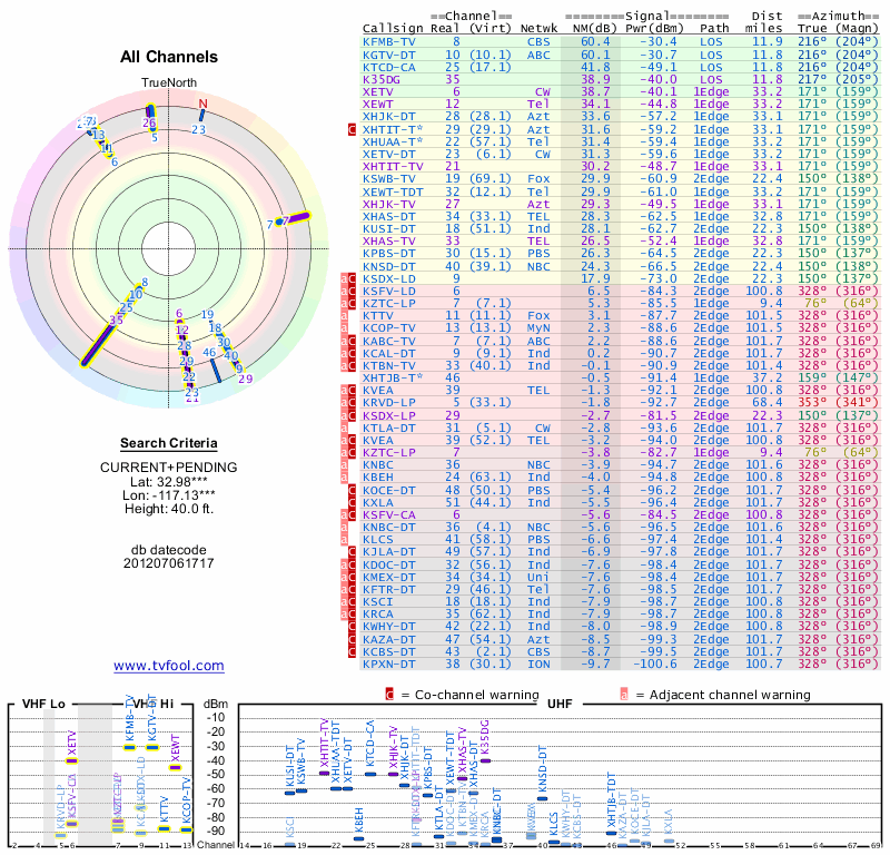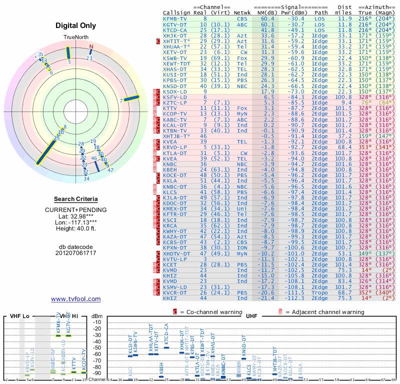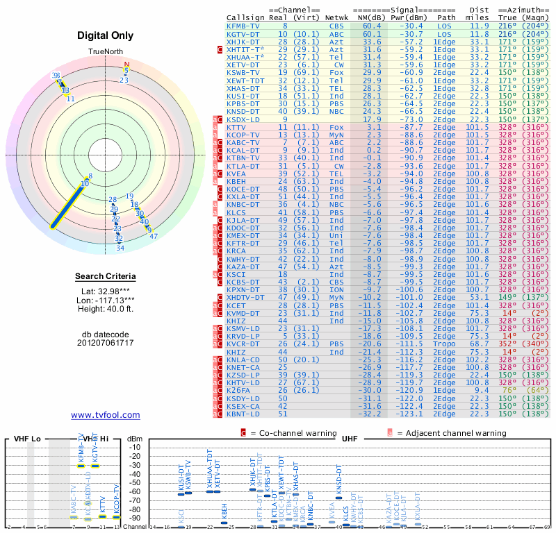 Here are the results for your location. The transmitter database was last updated on June 7, 2013. For more information about these plots and how to interpret them, please check out the Signal Analysis FAQ.