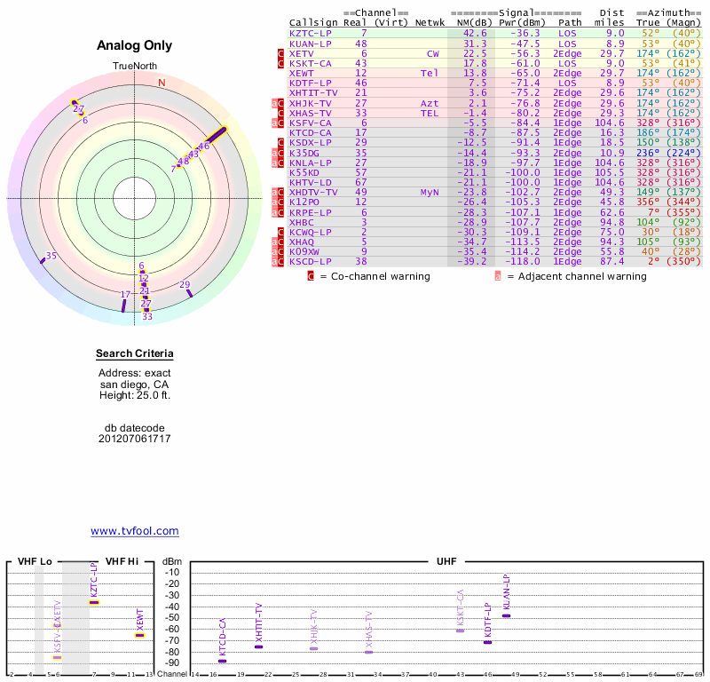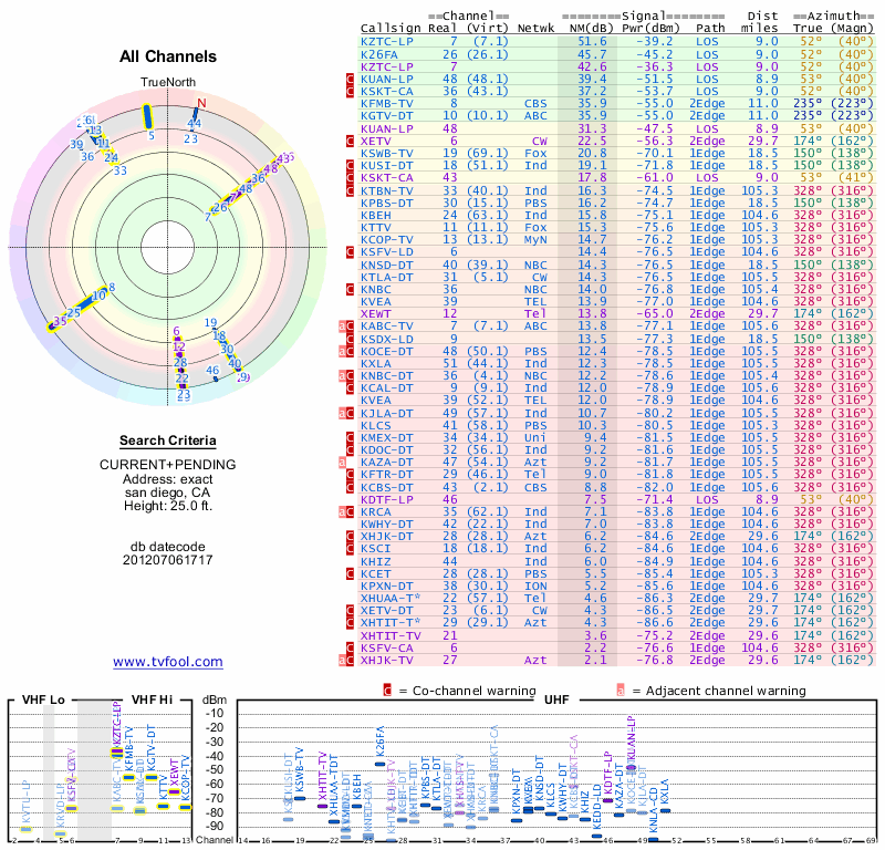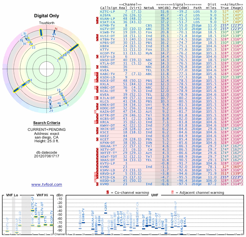 Here are the results for your location. The transmitter database was last updated on June 7, 2013. For more information about these plots and how to interpret them, please check out the Signal Analysis FAQ.
