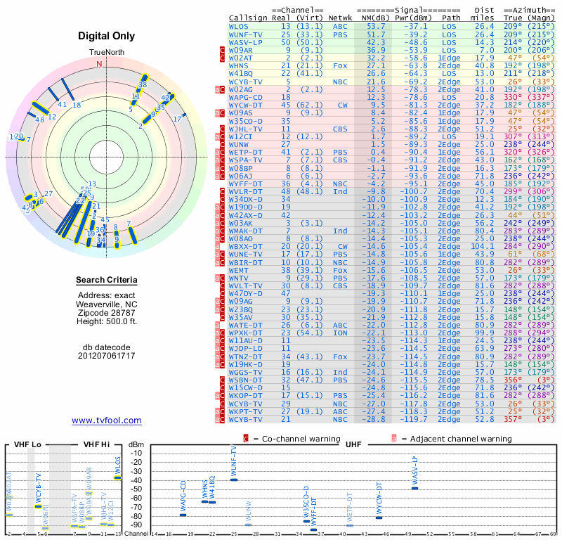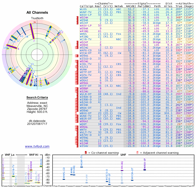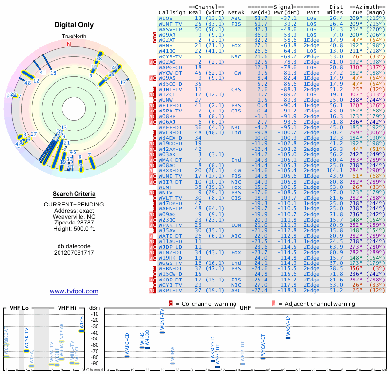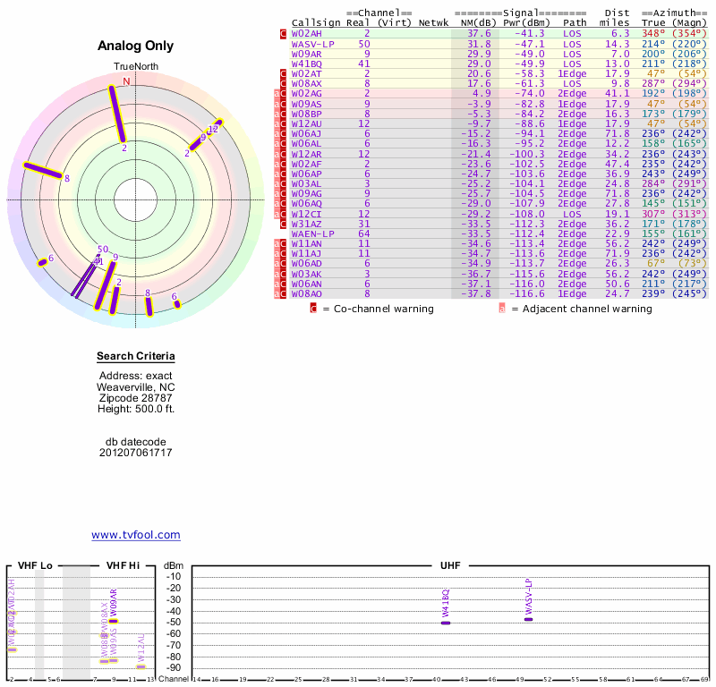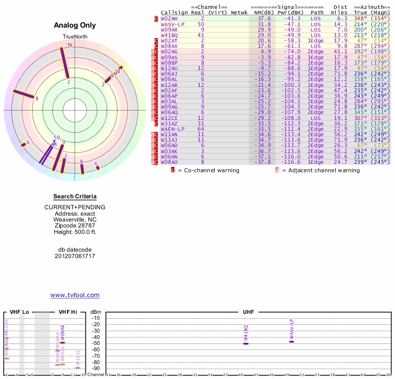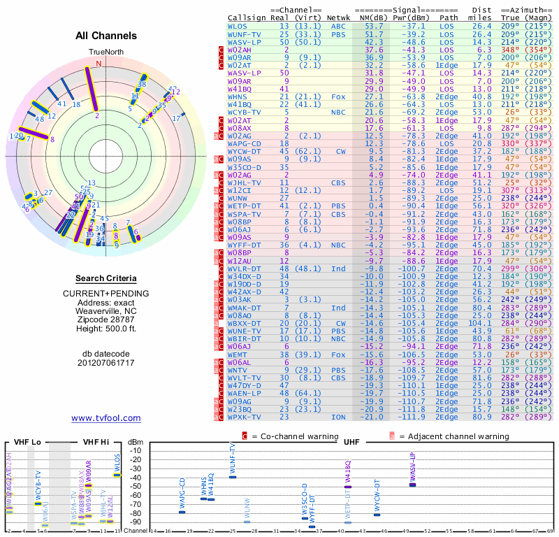 Here are the results for your location. The transmitter database was last updated on June 7, 2013. For more information about these plots and how to interpret them, please check out the Signal Analysis FAQ.