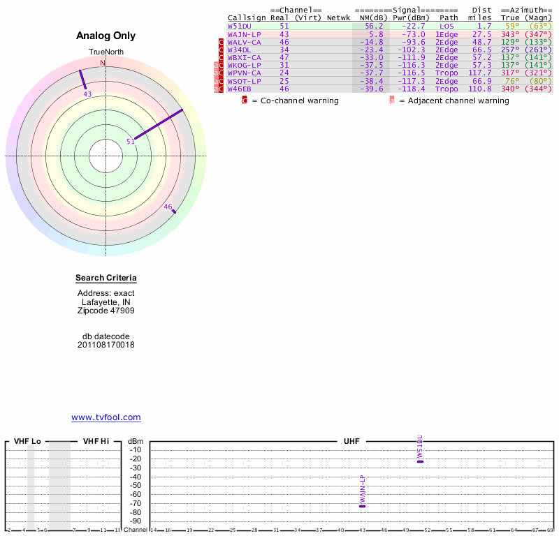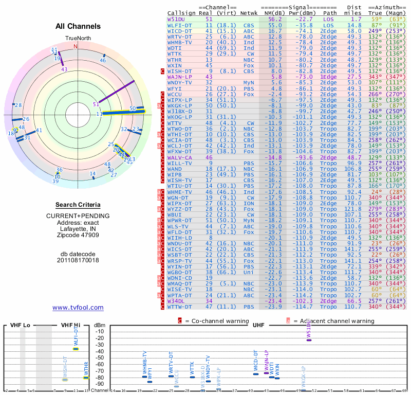 Here are the results for your location. The transmitter database was last updated on June 7, 2013. For more information about these plots and how to interpret them, please check out the Signal Analysis FAQ.