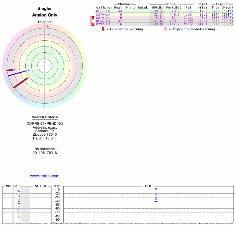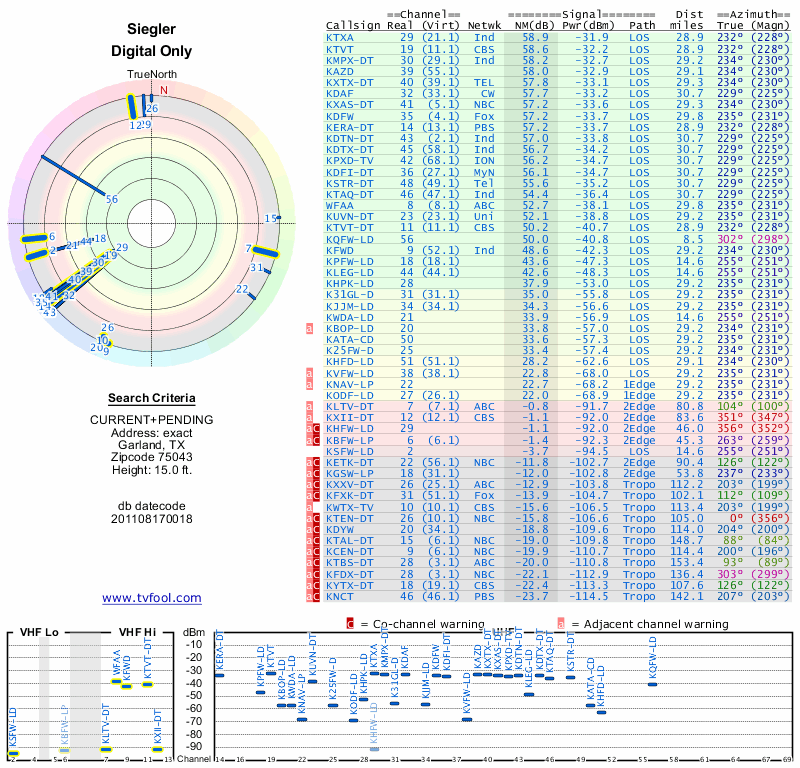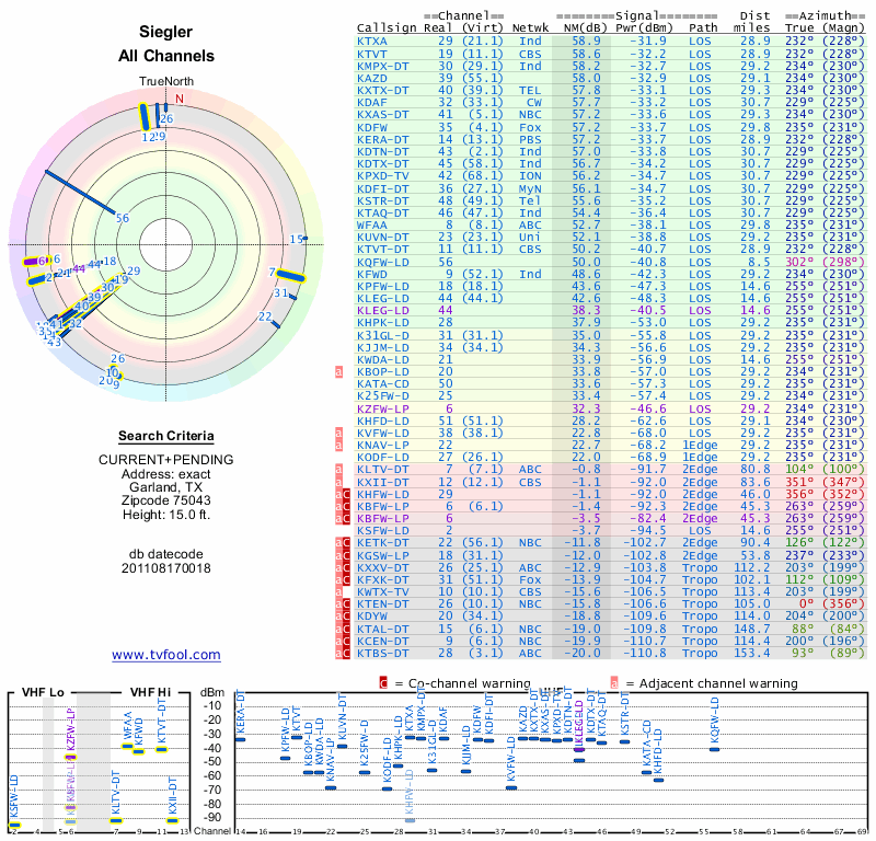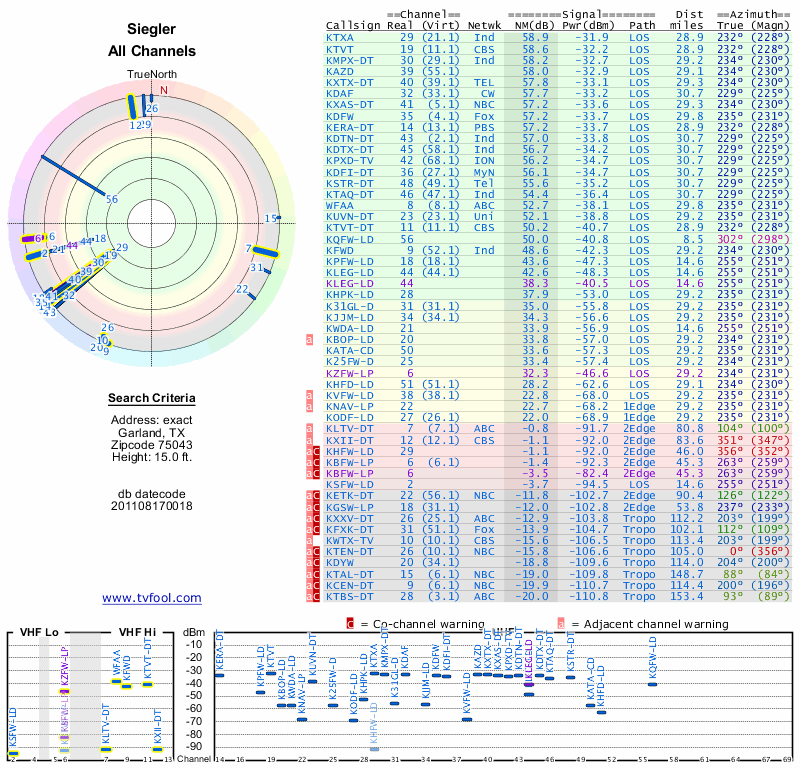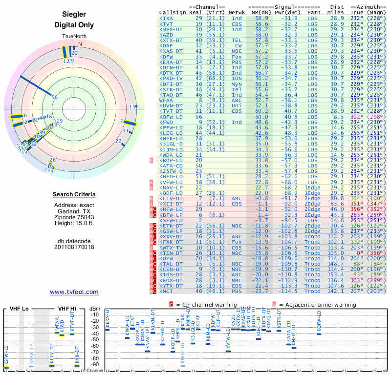 Here are the results for your location. The transmitter database was last updated on June 7, 2013. For more information about these plots and how to interpret them, please check out the Signal Analysis FAQ.