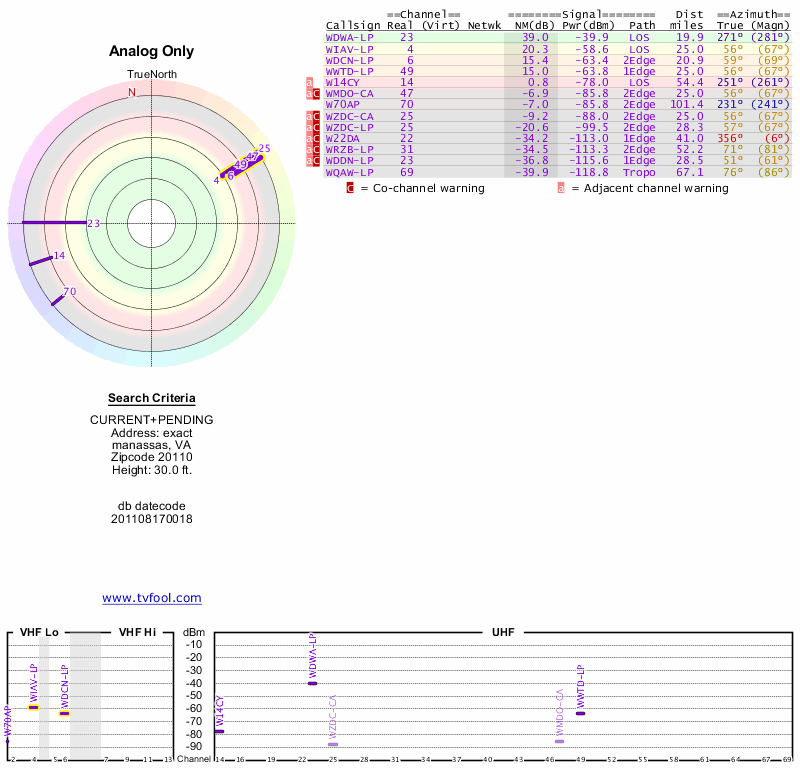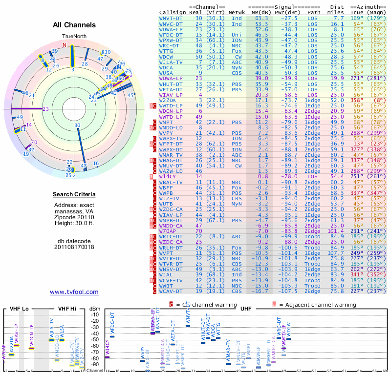 Here are the results for your location. The transmitter database was last updated on June 7, 2013. For more information about these plots and how to interpret them, please check out the Signal Analysis FAQ.