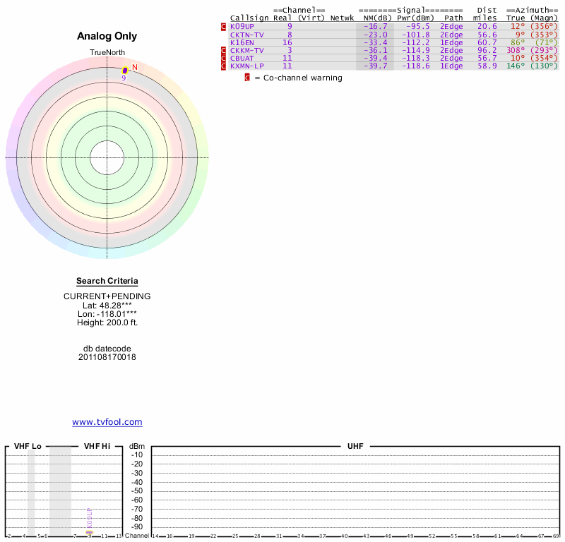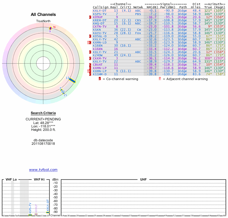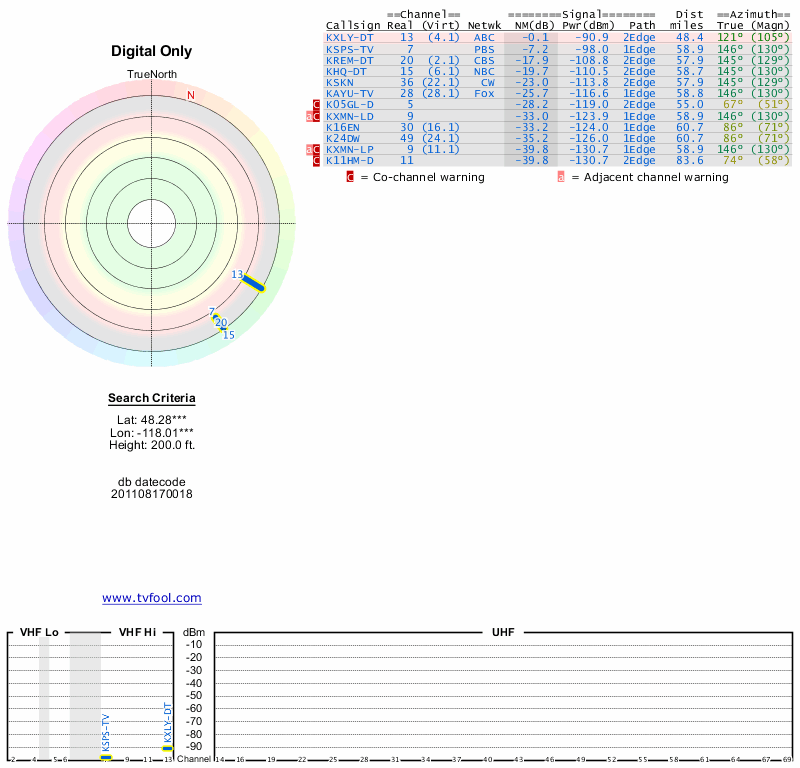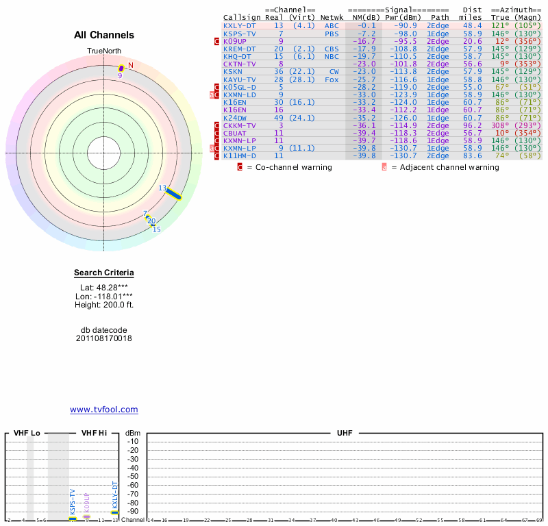 Here are the results for your location. The transmitter database was last updated on June 7, 2013. For more information about these plots and how to interpret them, please check out the Signal Analysis FAQ.