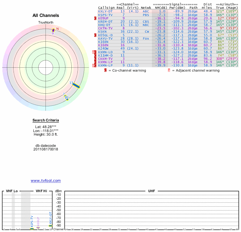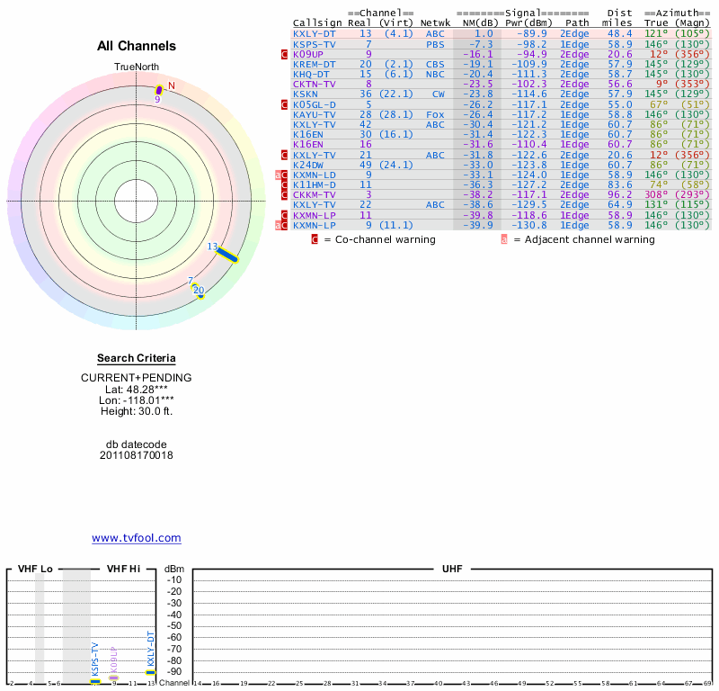 Here are the results for your location. The transmitter database was last updated on June 7, 2013. For more information about these plots and how to interpret them, please check out the Signal Analysis FAQ.