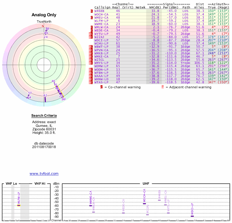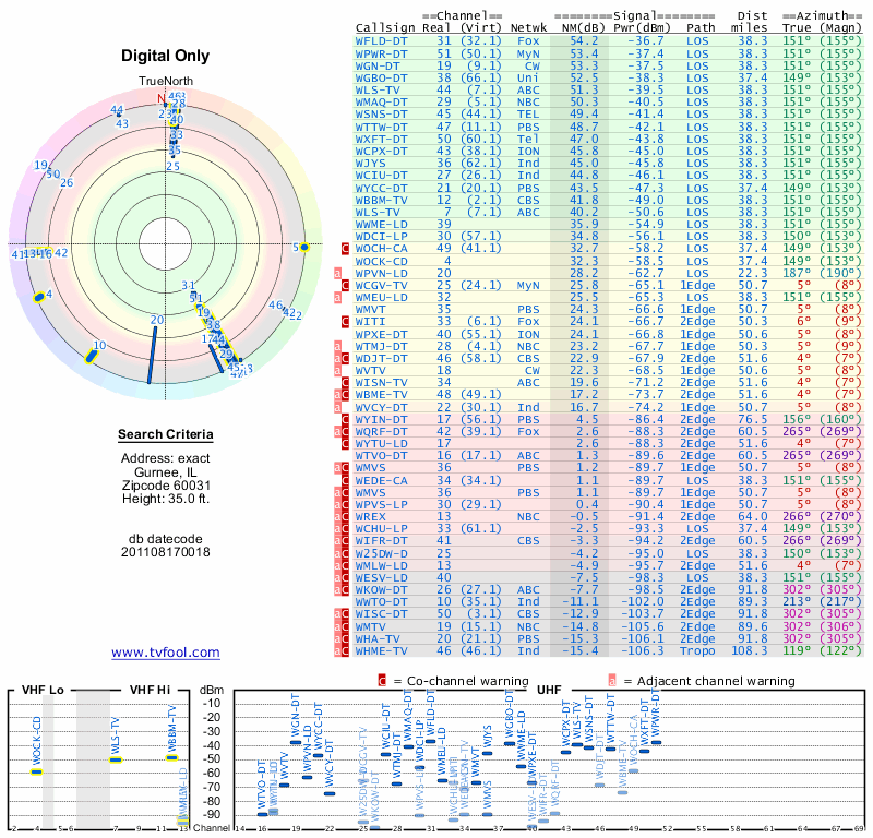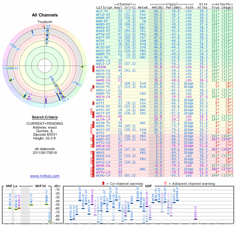 Here are the results for your location. The transmitter database was last updated on June 7, 2013. For more information about these plots and how to interpret them, please check out the Signal Analysis FAQ.