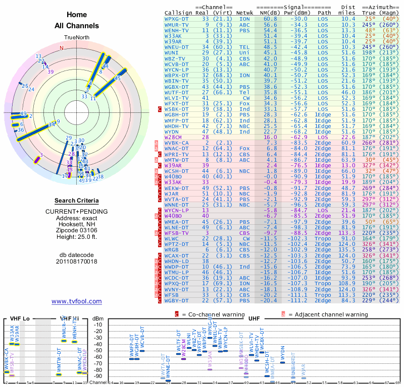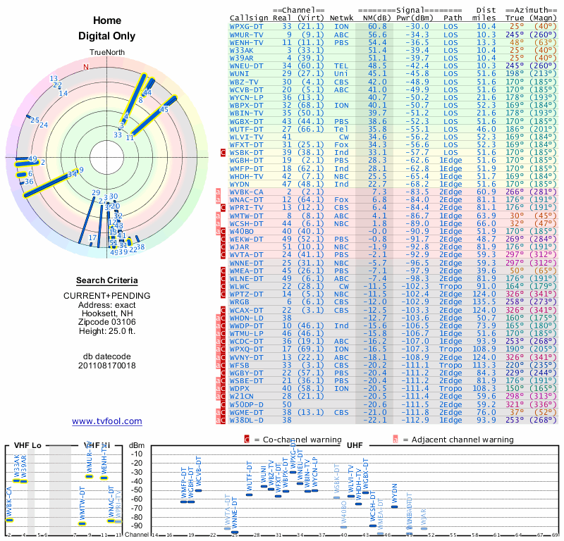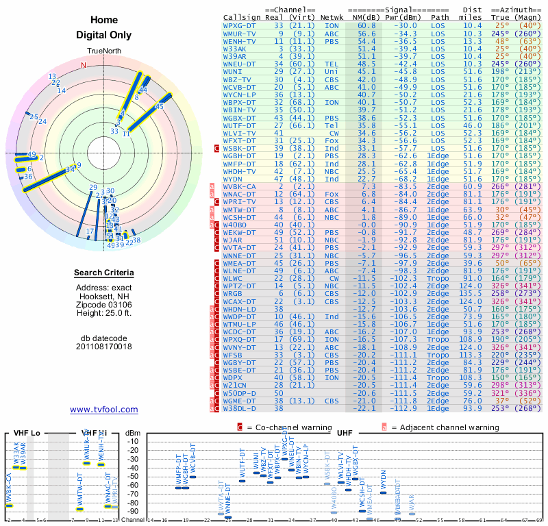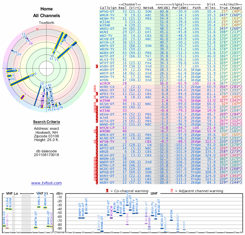Here are the results for your location. The transmitter database was last updated on June 7, 2013. For more information about these plots and how to interpret them, please check out the Signal Analysis FAQ.
