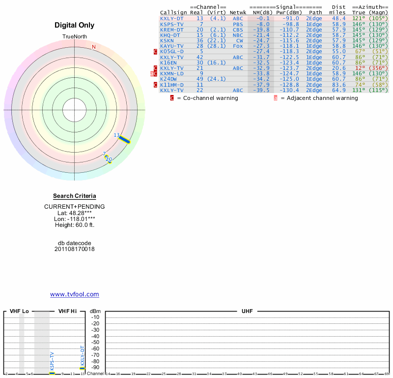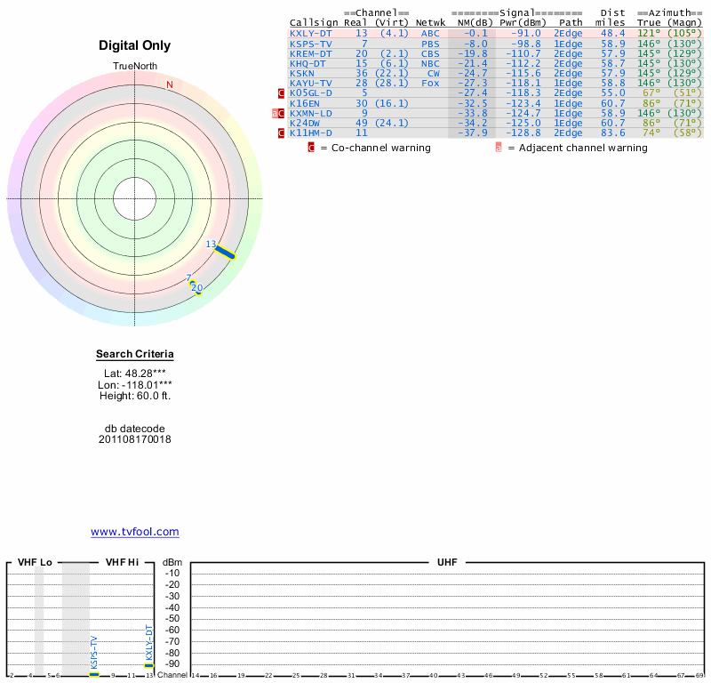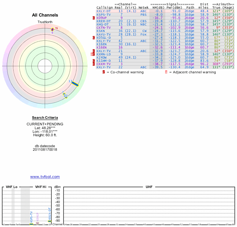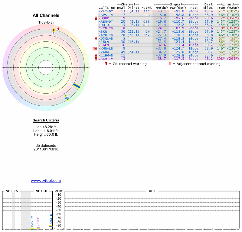 Here are the results for your location. The transmitter database was last updated on June 7, 2013. For more information about these plots and how to interpret them, please check out the Signal Analysis FAQ.