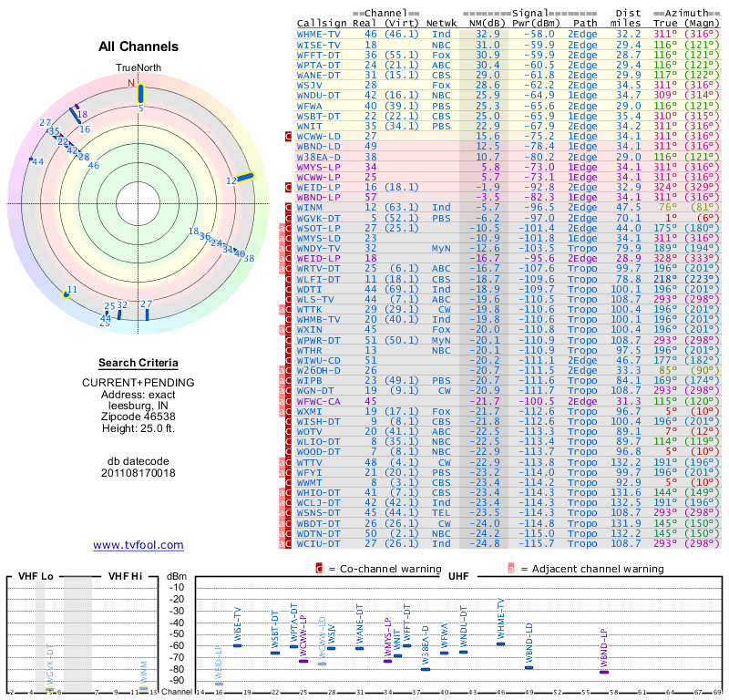 Here are the results for your location. The transmitter database was last updated on June 7, 2013. For more information about these plots and how to interpret them, please check out the Signal Analysis FAQ.