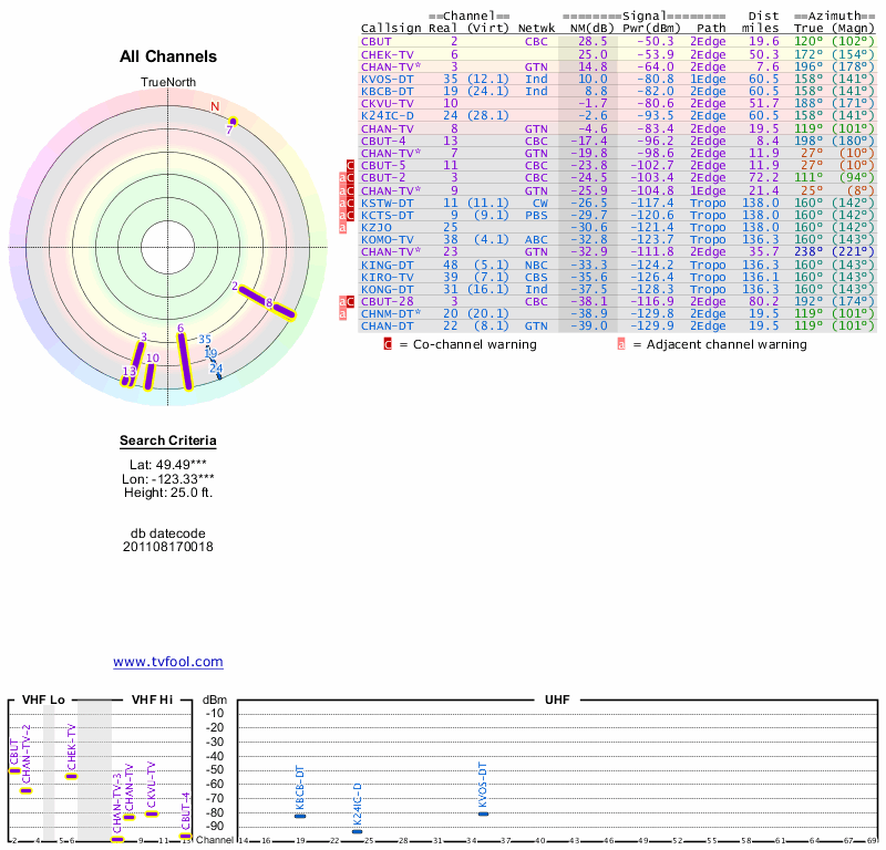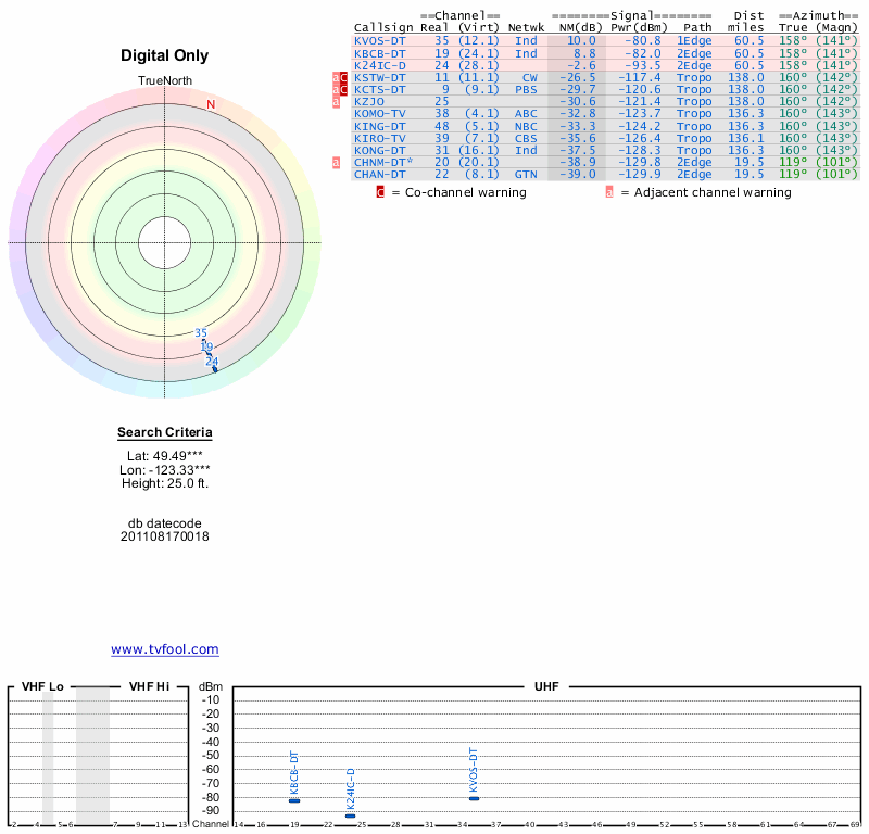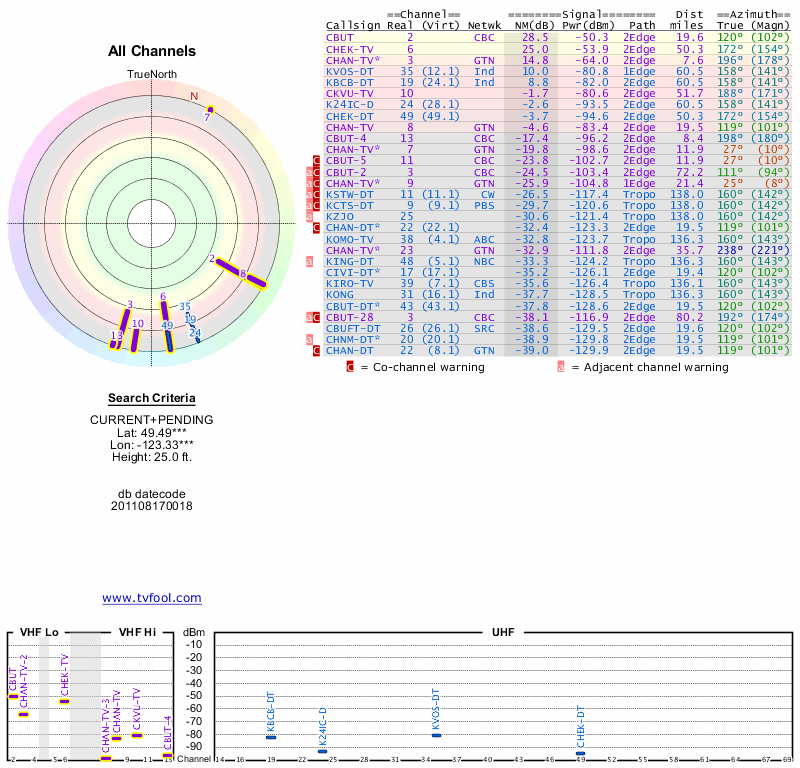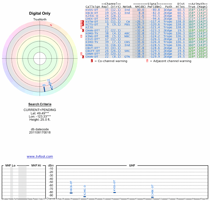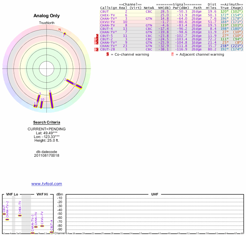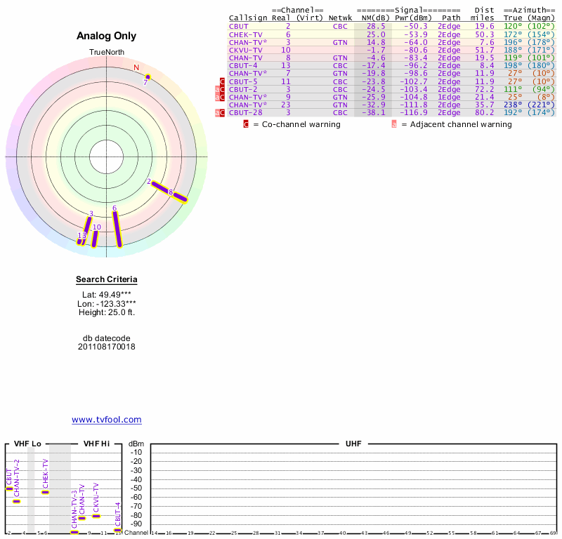 Here are the results for your location. The transmitter database was last updated on June 7, 2013. For more information about these plots and how to interpret them, please check out the Signal Analysis FAQ.