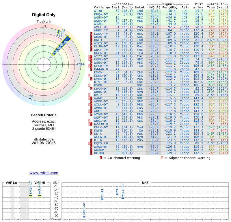 Here are the results for your location. The transmitter database was last updated on June 7, 2013. For more information about these plots and how to interpret them, please check out the Signal Analysis FAQ.