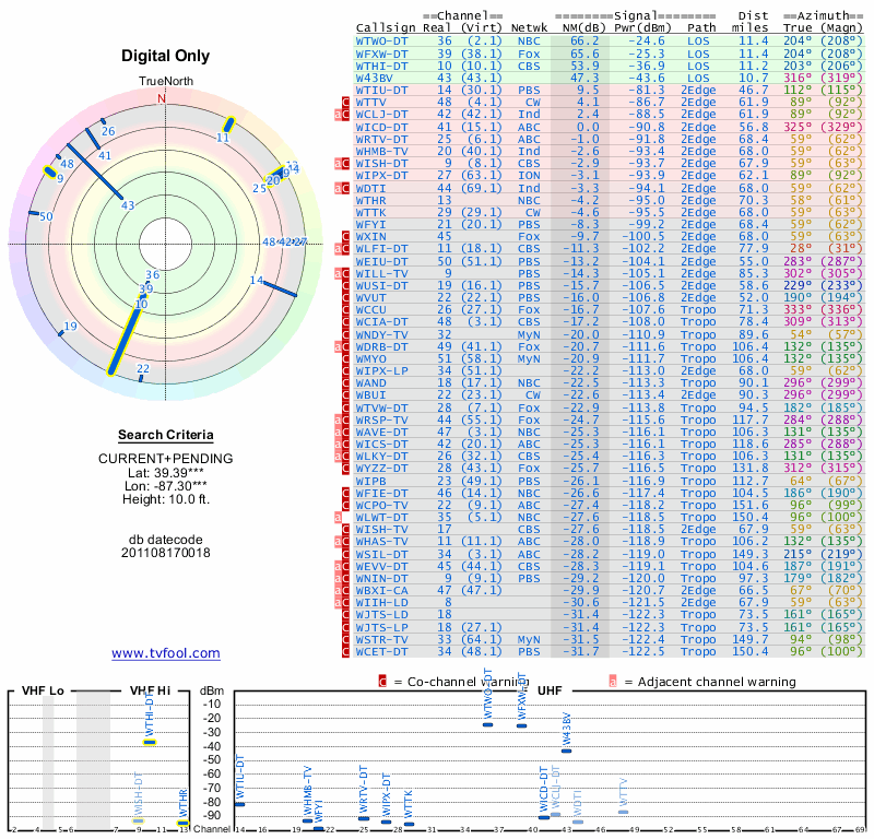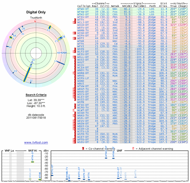 Here are the results for your location. The transmitter database was last updated on June 7, 2013. For more information about these plots and how to interpret them, please check out the Signal Analysis FAQ.