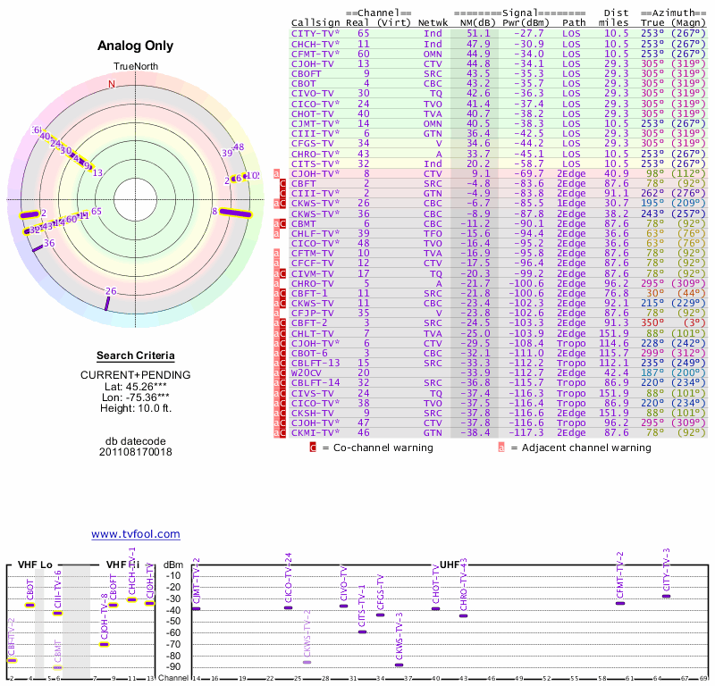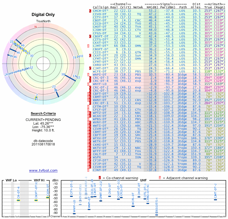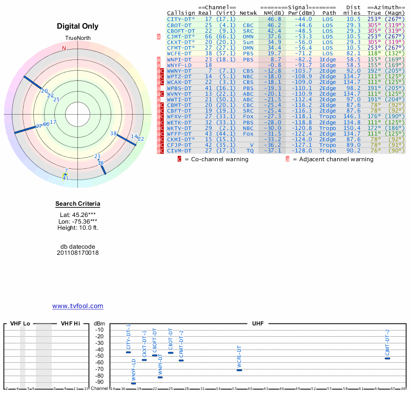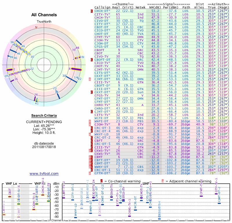 Here are the results for your location. The transmitter database was last updated on June 7, 2013. For more information about these plots and how to interpret them, please check out the Signal Analysis FAQ.