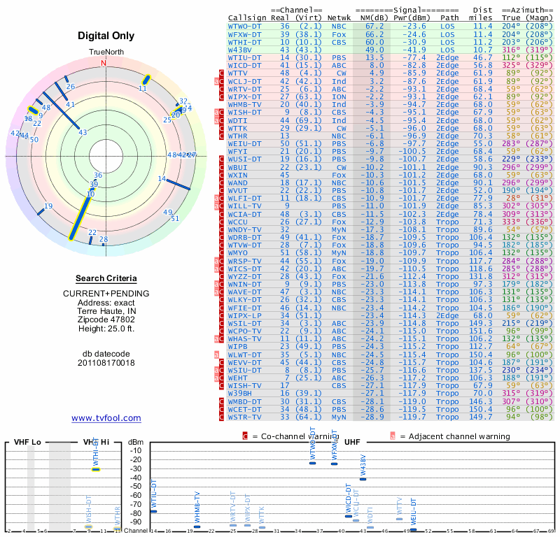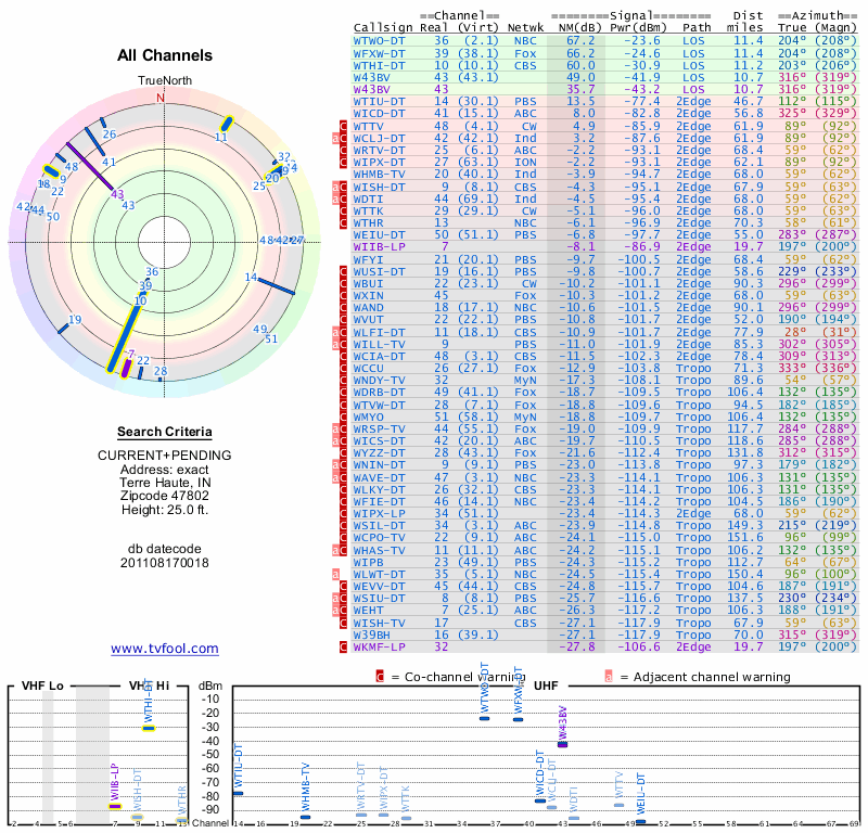Here are the results for your location. The transmitter database was last updated on June 7, 2013. For more information about these plots and how to interpret them, please check out the Signal Analysis FAQ.