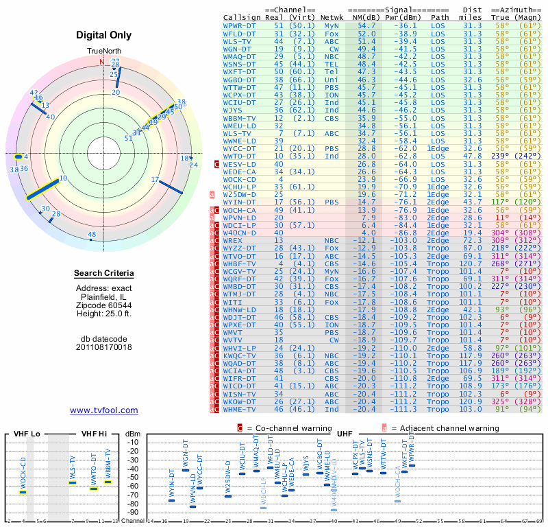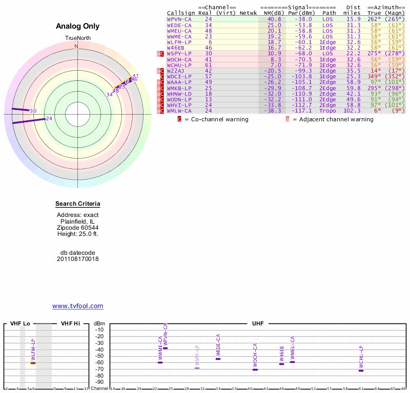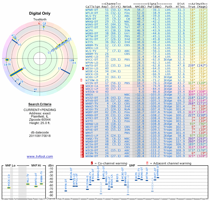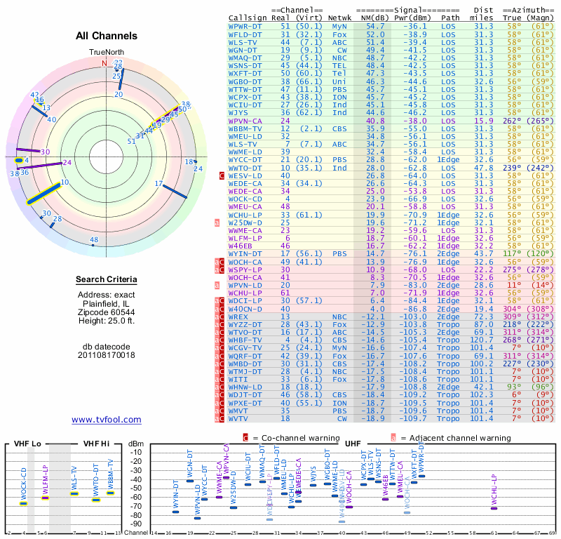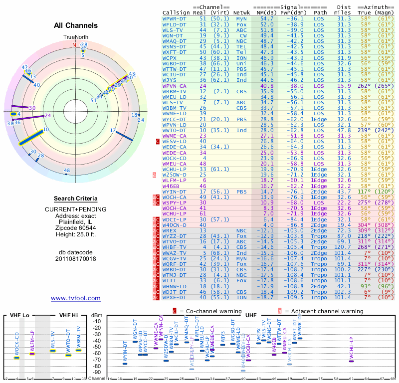 Here are the results for your location. The transmitter database was last updated on June 7, 2013. For more information about these plots and how to interpret them, please check out the Signal Analysis FAQ.