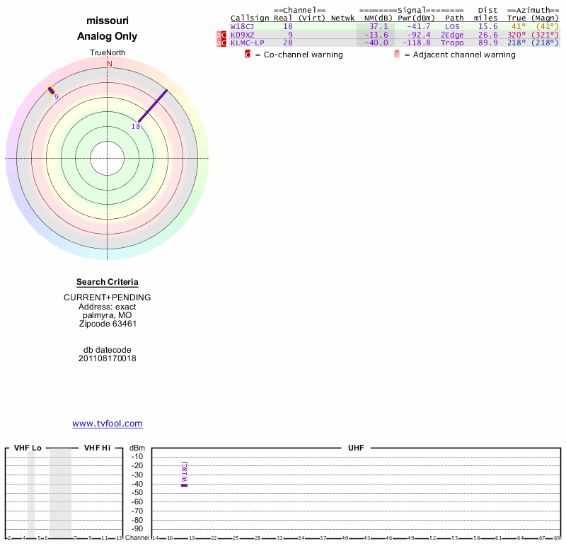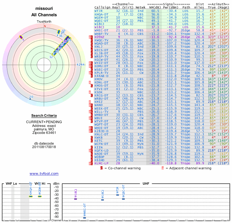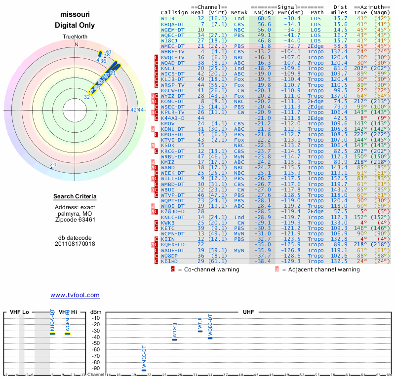 Here are the results for your location. The transmitter database was last updated on June 7, 2013. For more information about these plots and how to interpret them, please check out the Signal Analysis FAQ.