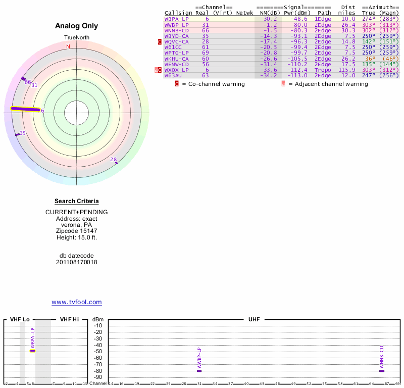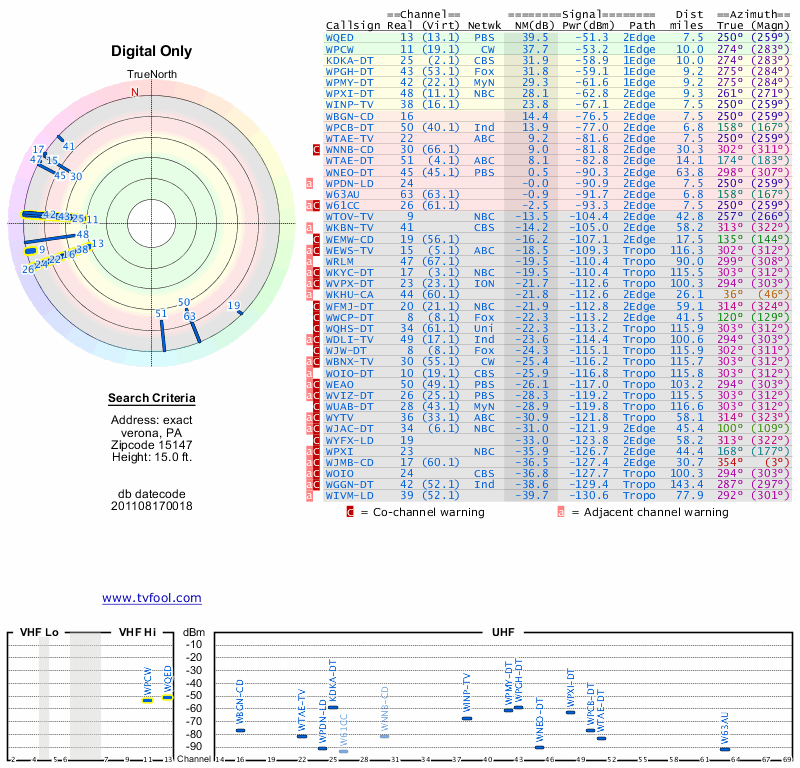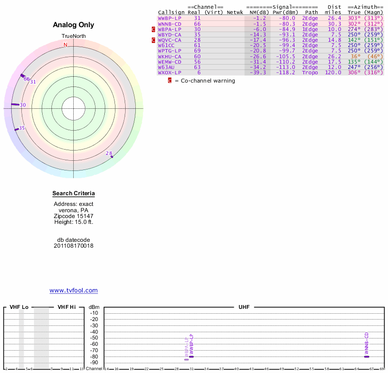 Here are the results for your location. The transmitter database was last updated on June 7, 2013. For more information about these plots and how to interpret them, please check out the Signal Analysis FAQ.