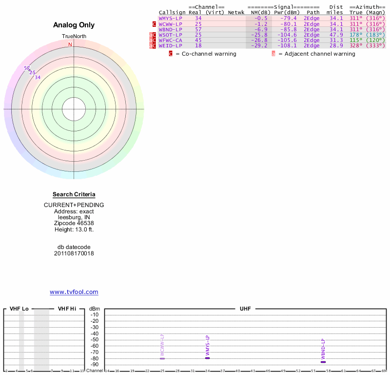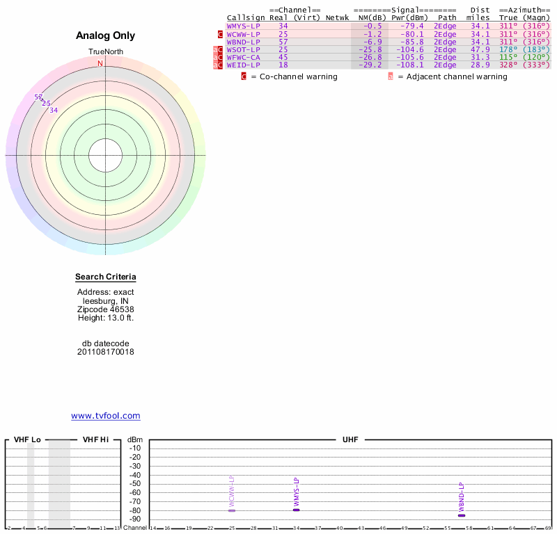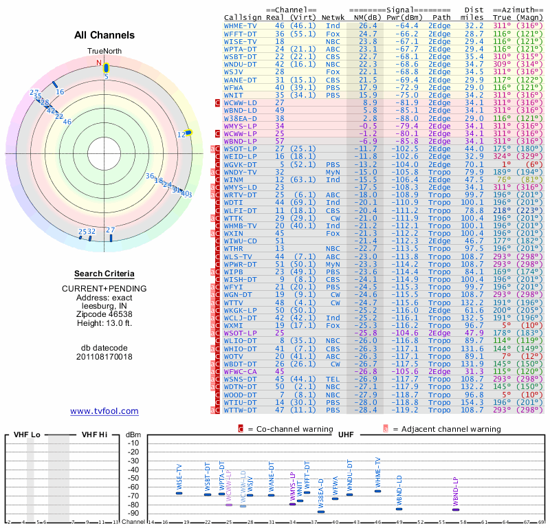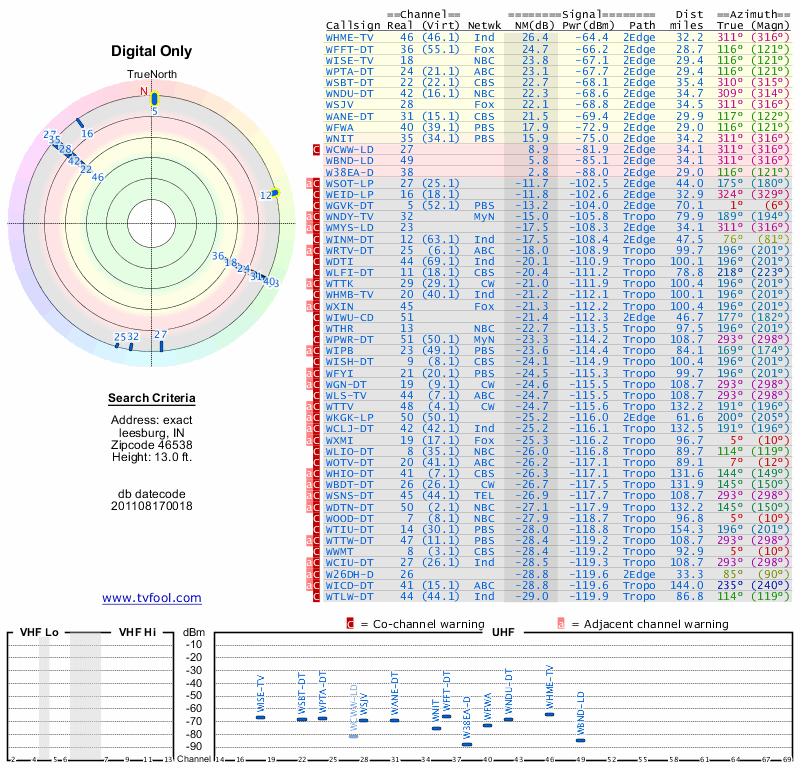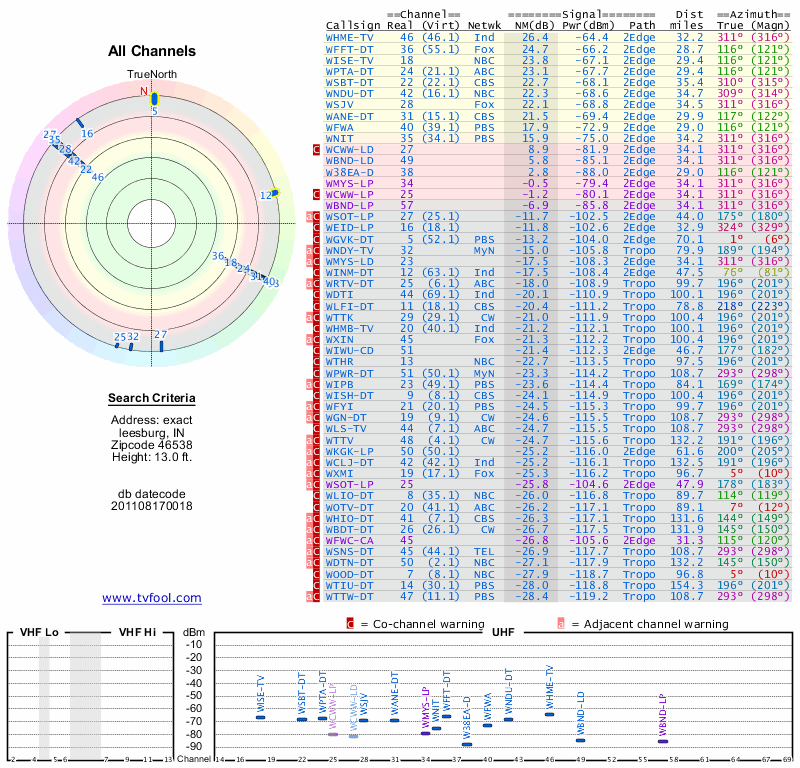 Here are the results for your location. The transmitter database was last updated on June 7, 2013. For more information about these plots and how to interpret them, please check out the Signal Analysis FAQ.