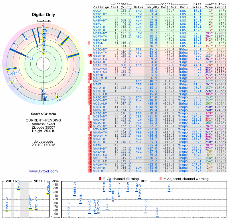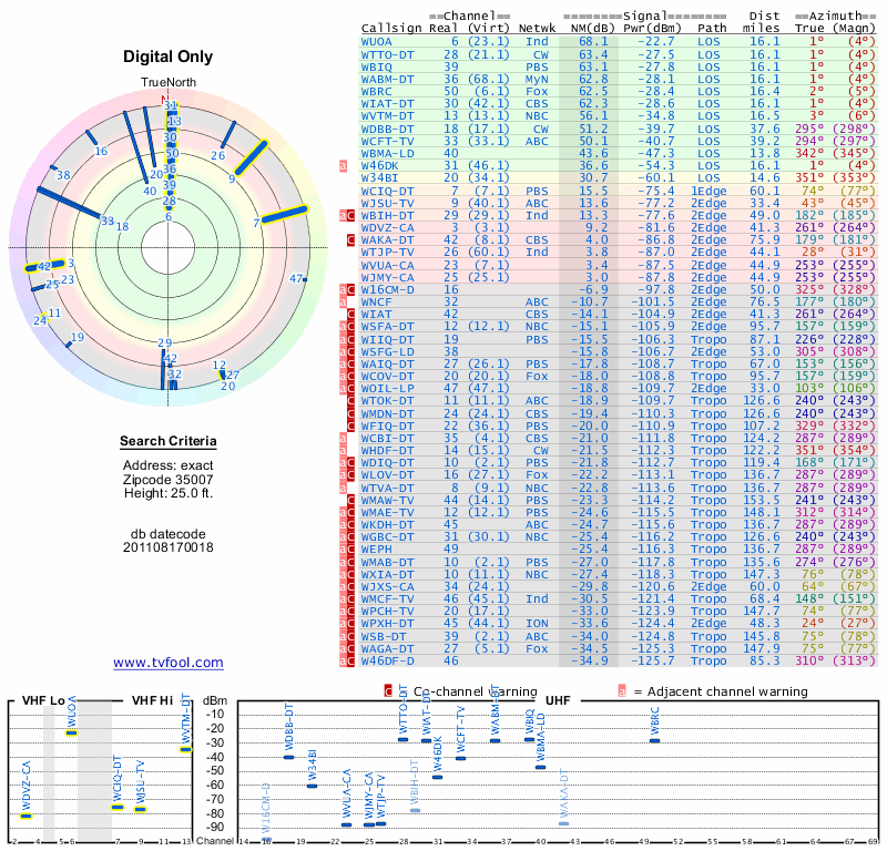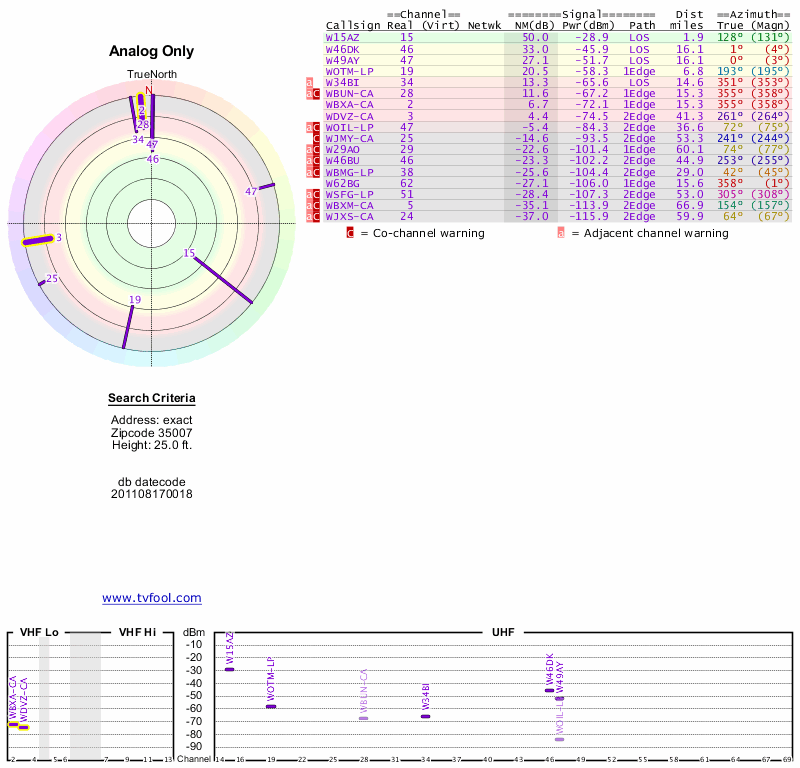Here are the results for your location. The transmitter database was last updated on June 7, 2013. For more information about these plots and how to interpret them, please check out the Signal Analysis FAQ.