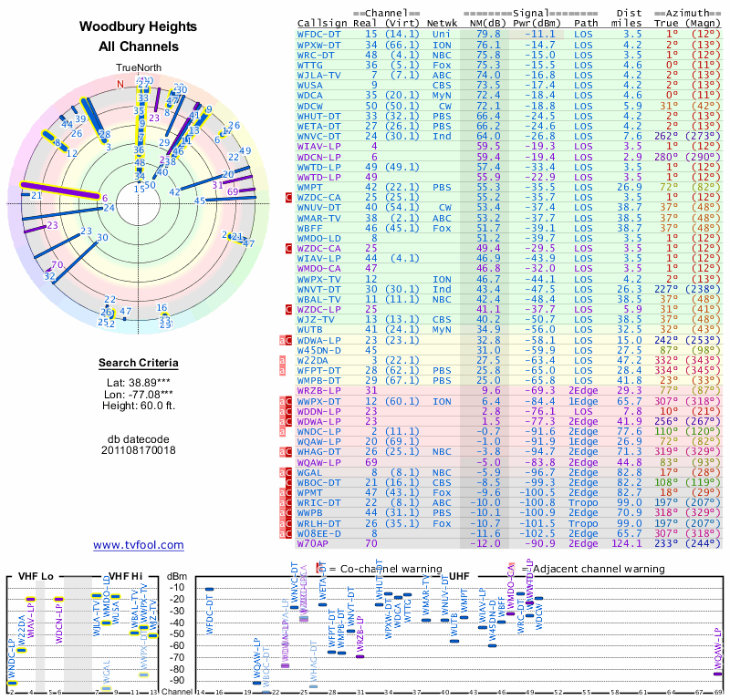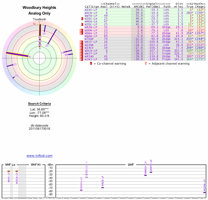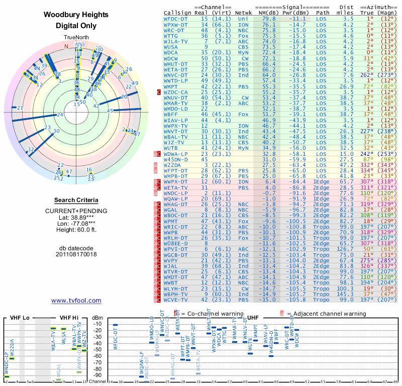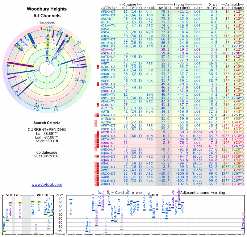 Here are the results for your location. The transmitter database was last updated on June 7, 2013. For more information about these plots and how to interpret them, please check out the Signal Analysis FAQ.