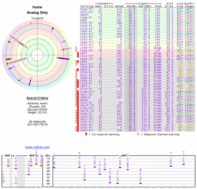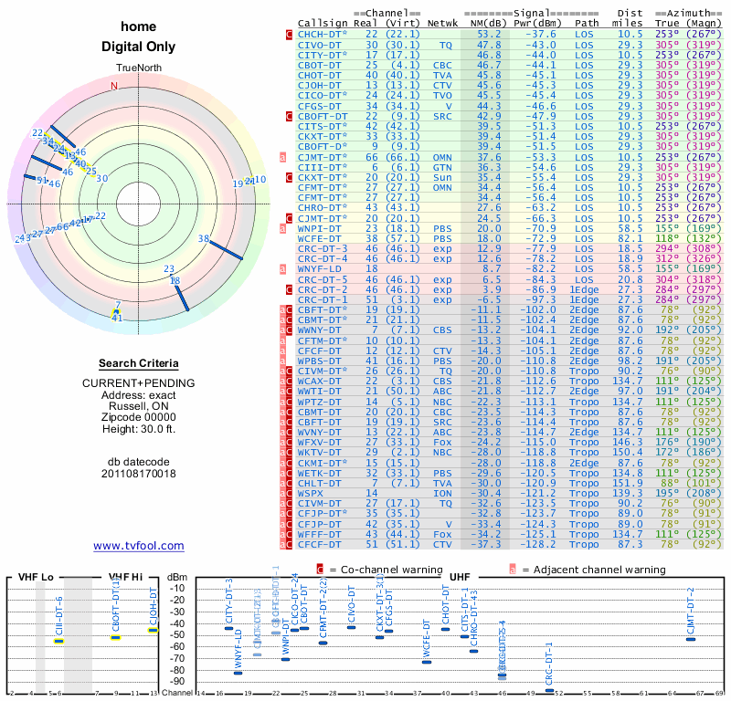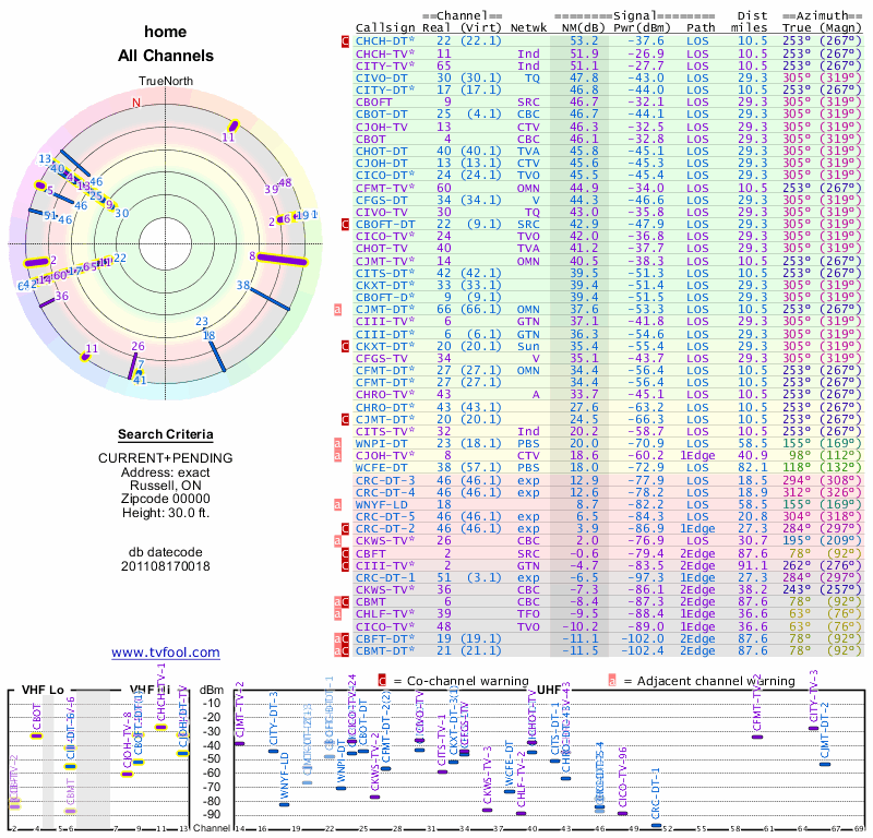 Here are the results for your location. The transmitter database was last updated on June 7, 2013. For more information about these plots and how to interpret them, please check out the Signal Analysis FAQ.