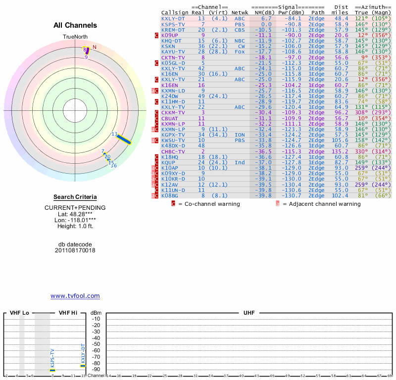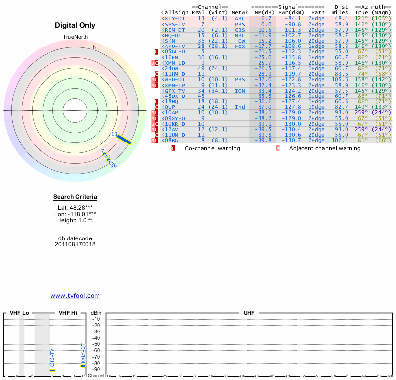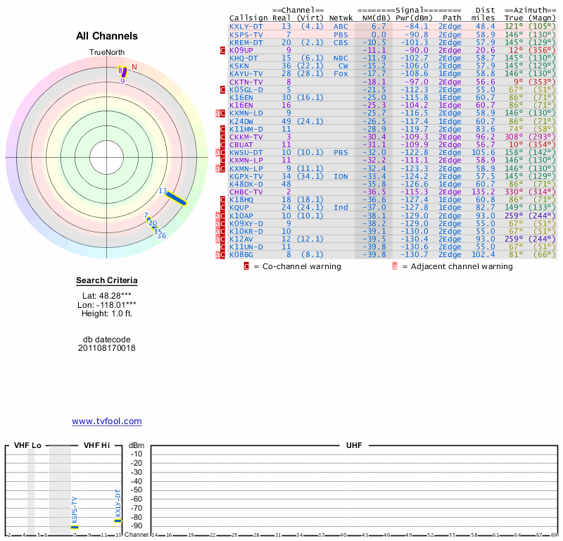 Here are the results for your location. The transmitter database was last updated on June 7, 2013. For more information about these plots and how to interpret them, please check out the Signal Analysis FAQ.