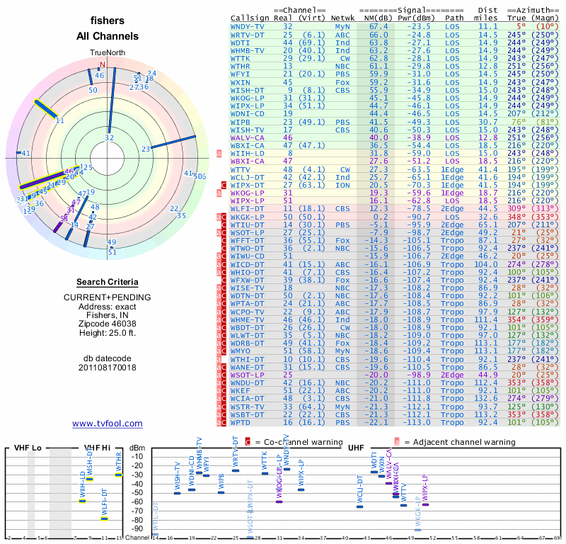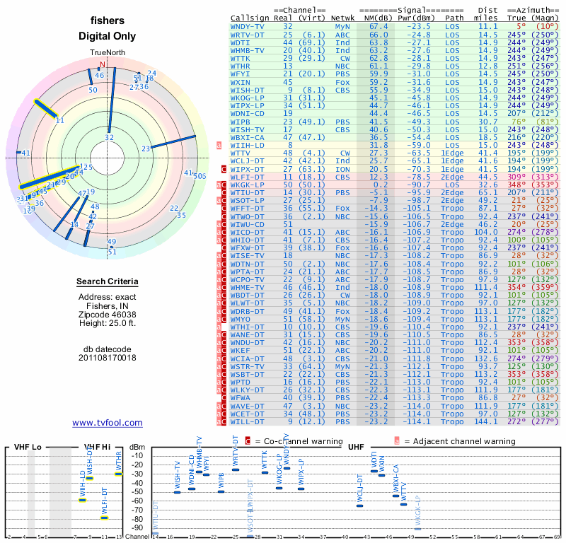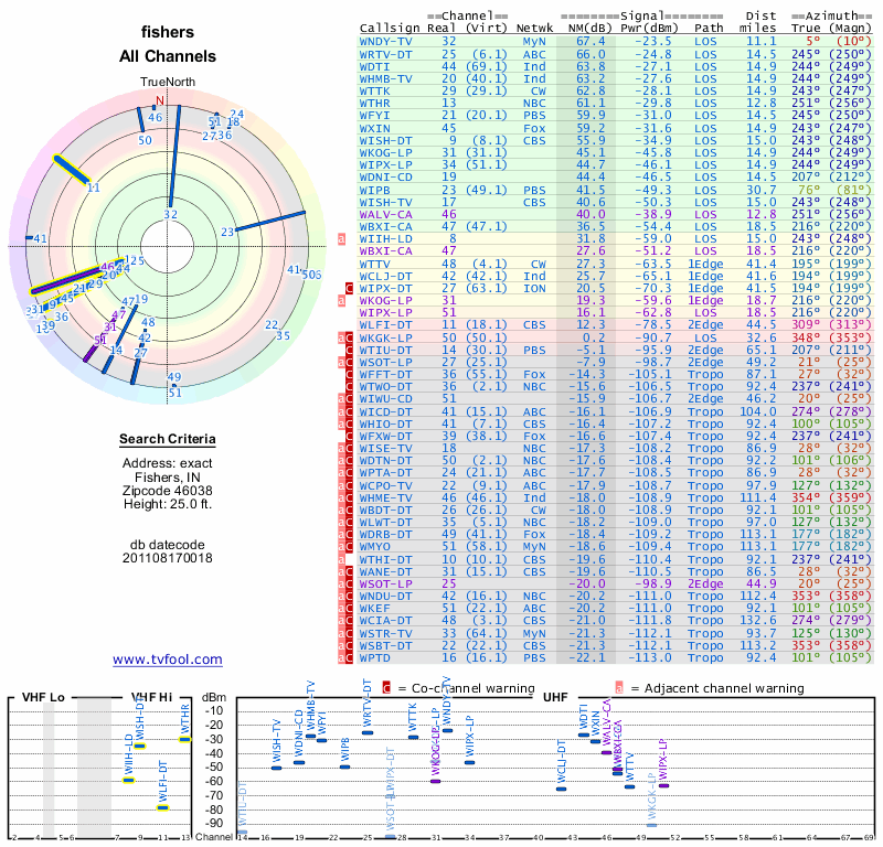 Here are the results for your location. The transmitter database was last updated on June 7, 2013. For more information about these plots and how to interpret them, please check out the Signal Analysis FAQ.