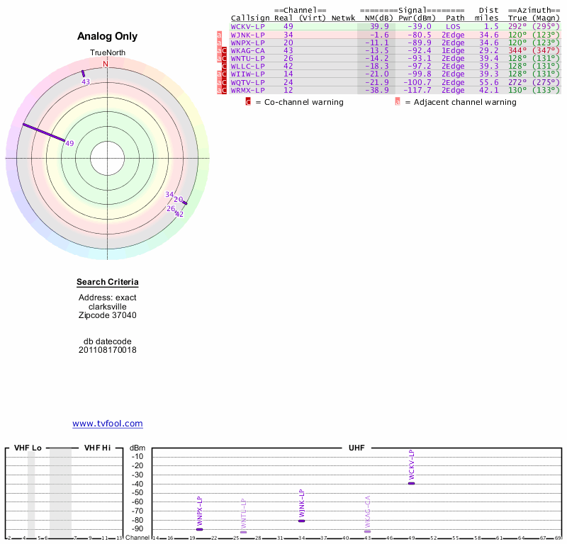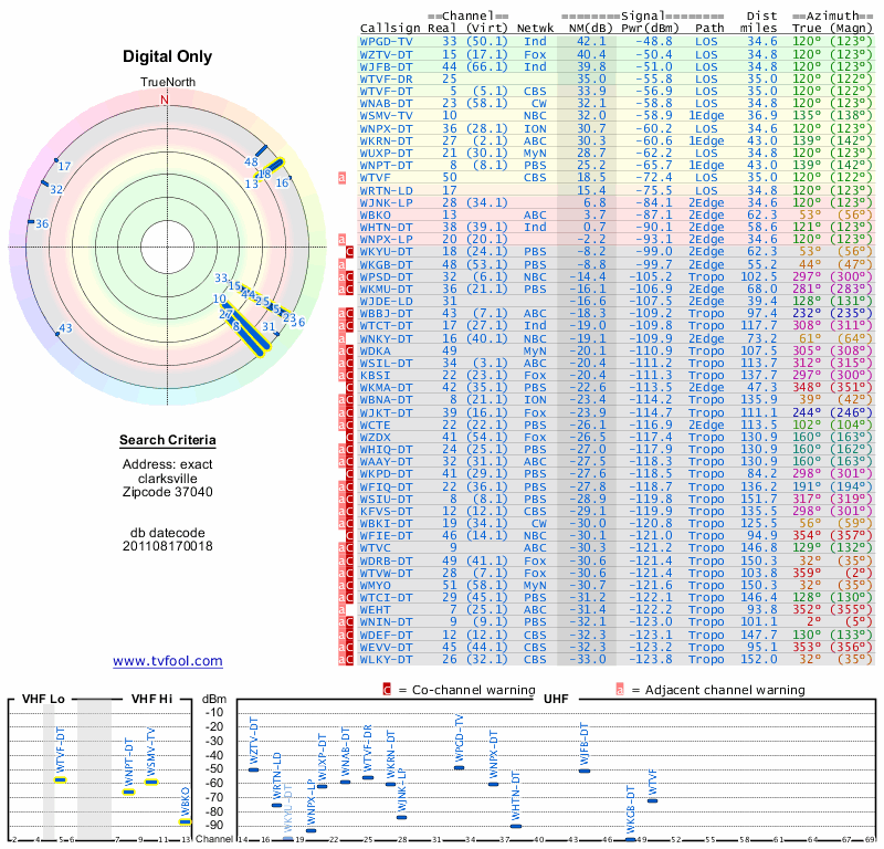 Here are the results for your location. The transmitter database was last updated on June 7, 2013. For more information about these plots and how to interpret them, please check out the Signal Analysis FAQ.