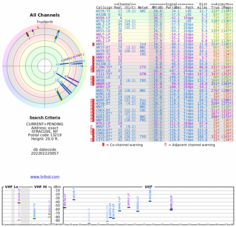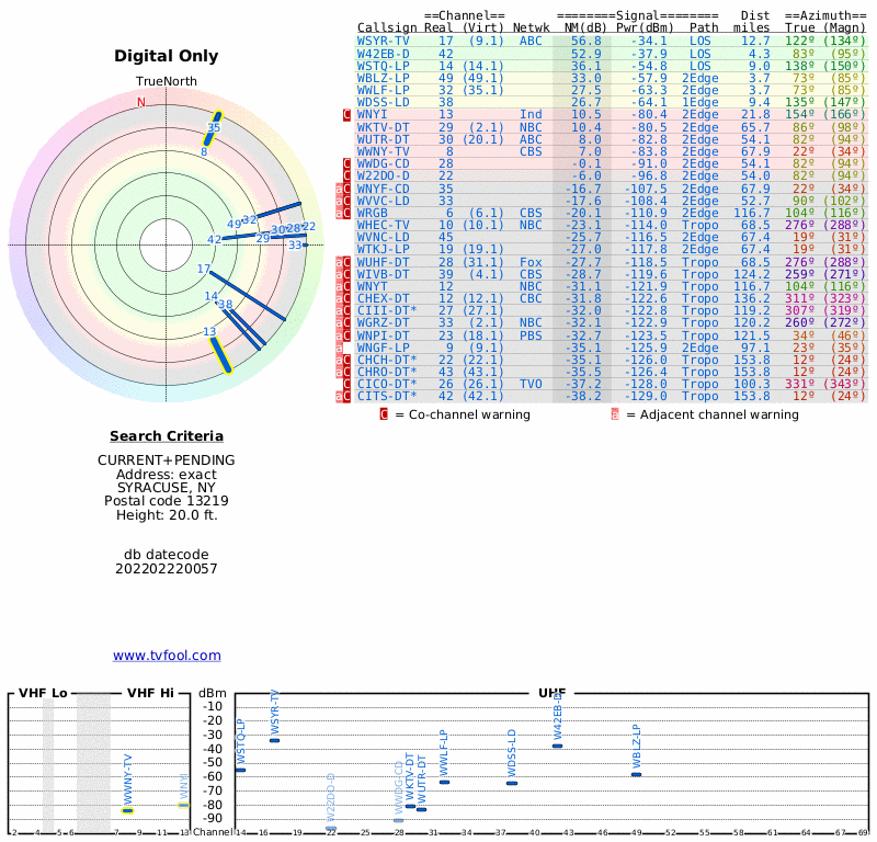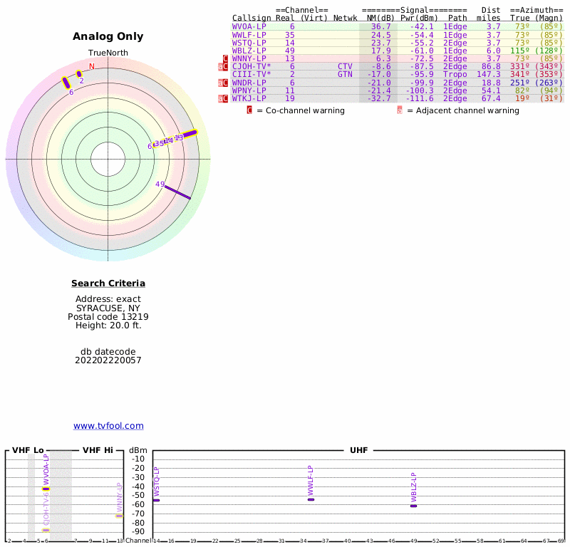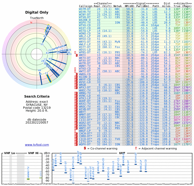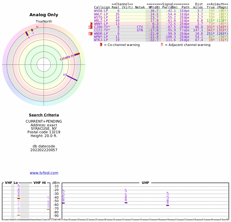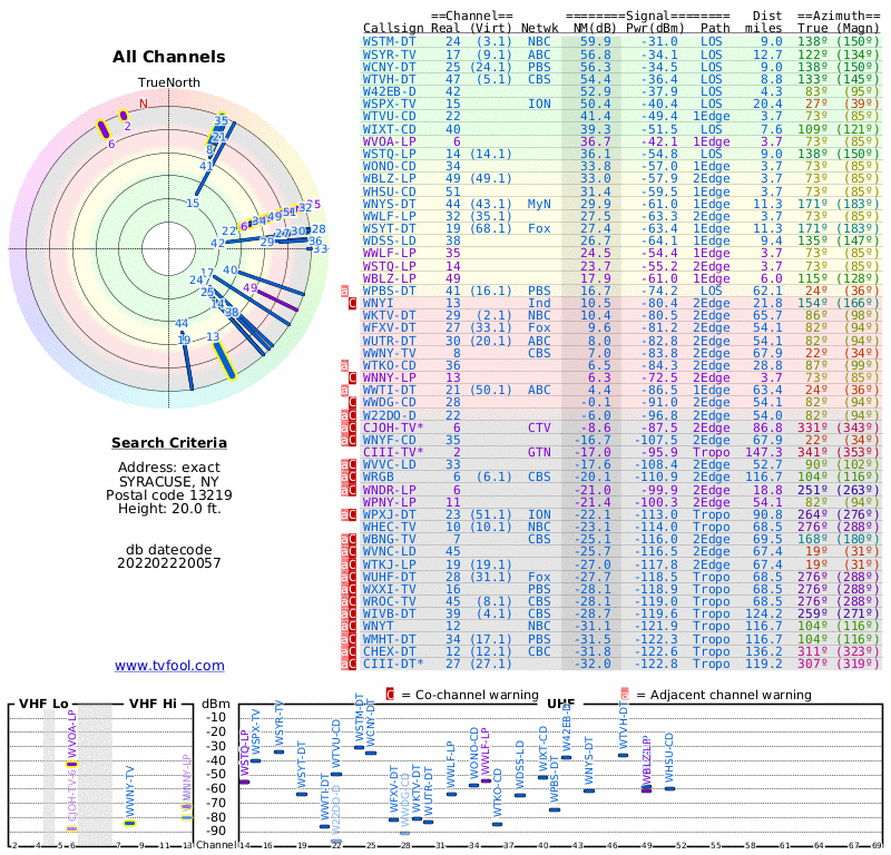 Here are the results for your location. The transmitter database was last updated on July 24, 2017. For more information about these plots and how to interpret them, please check out the Signal Analysis FAQ.