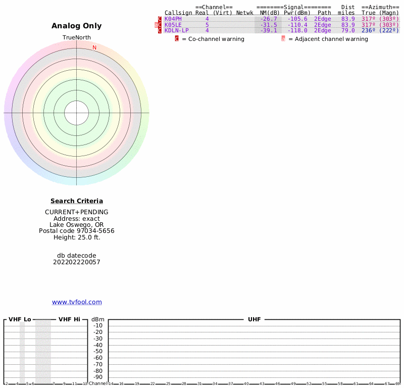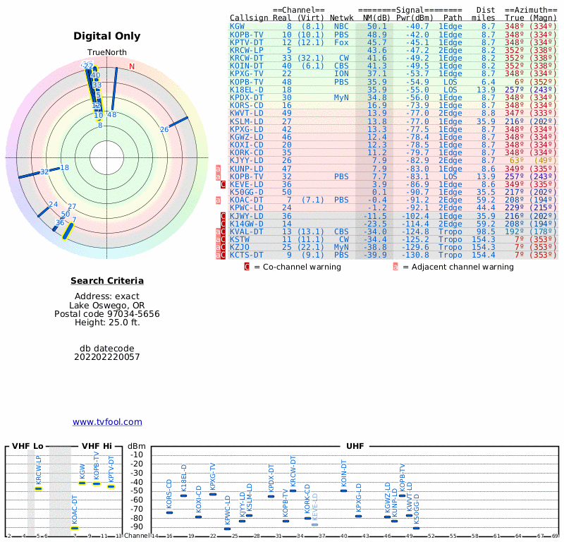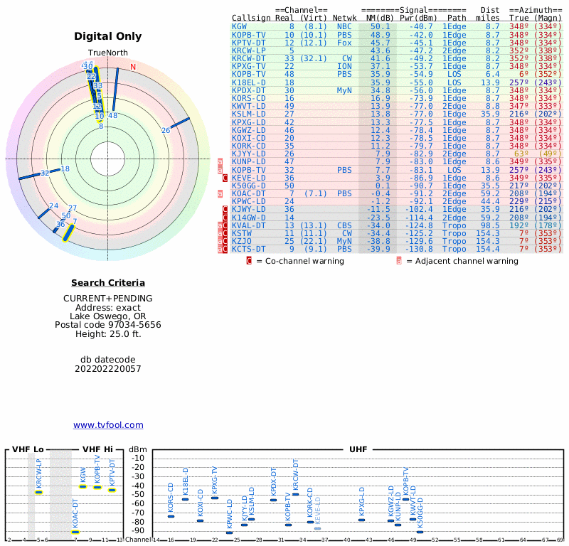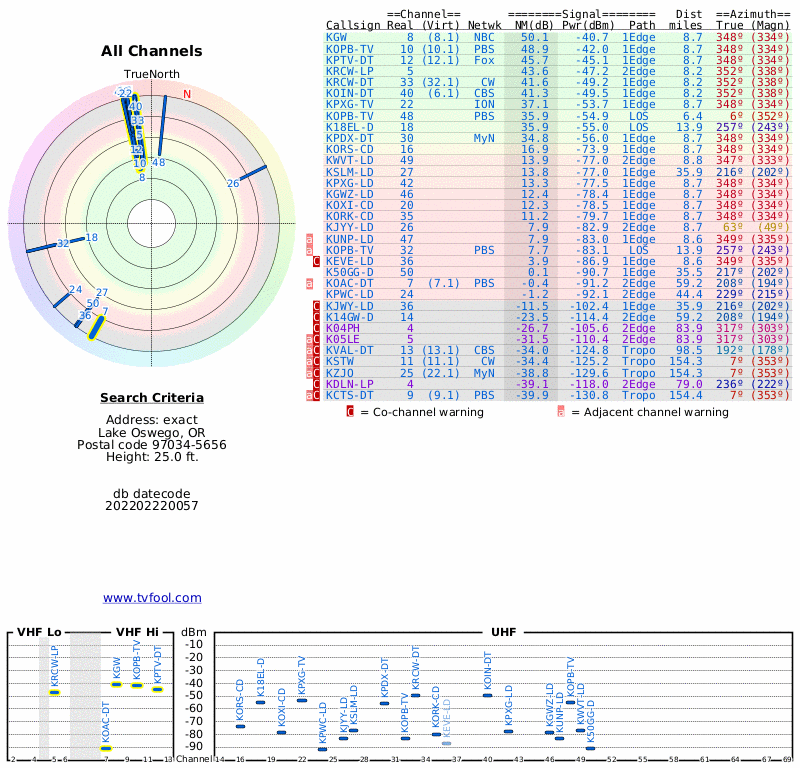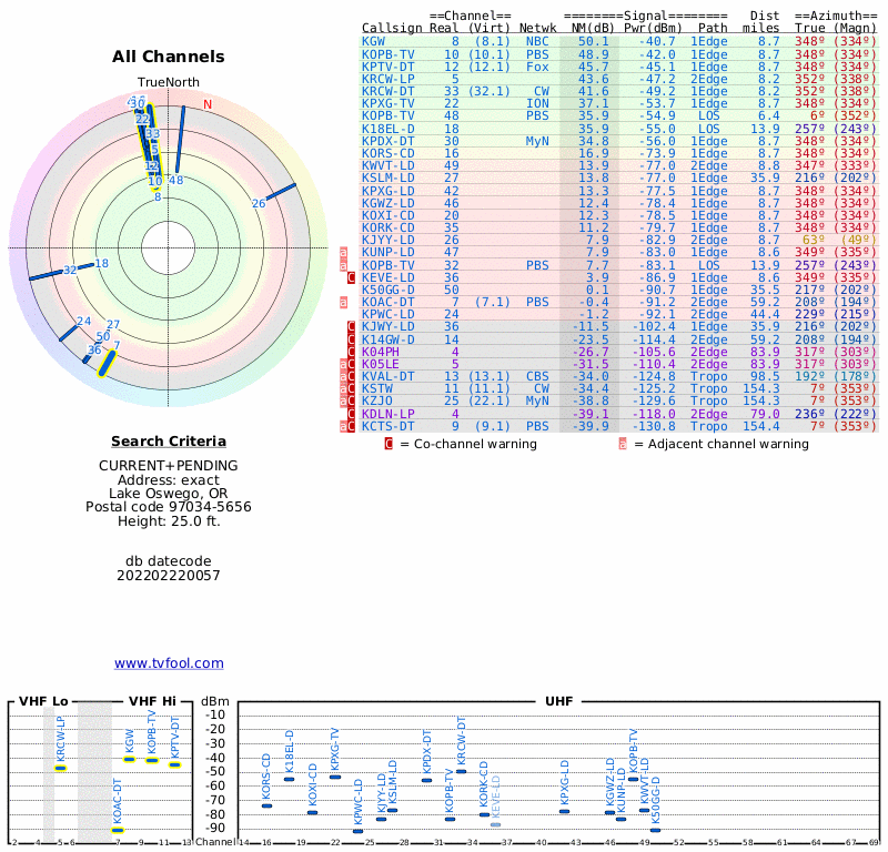 Here are the results for your location. The transmitter database was last updated on July 24, 2017. For more information about these plots and how to interpret them, please check out the Signal Analysis FAQ.