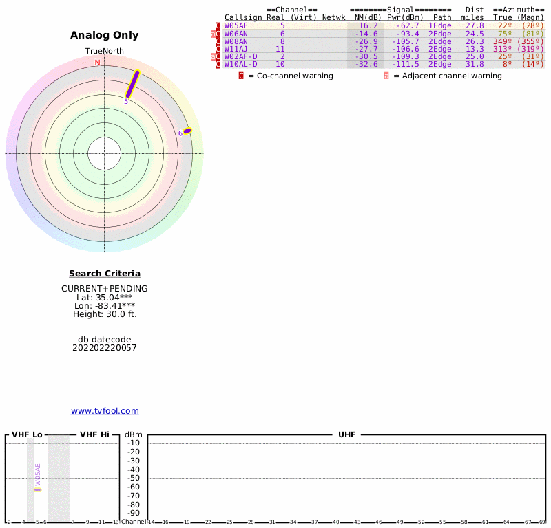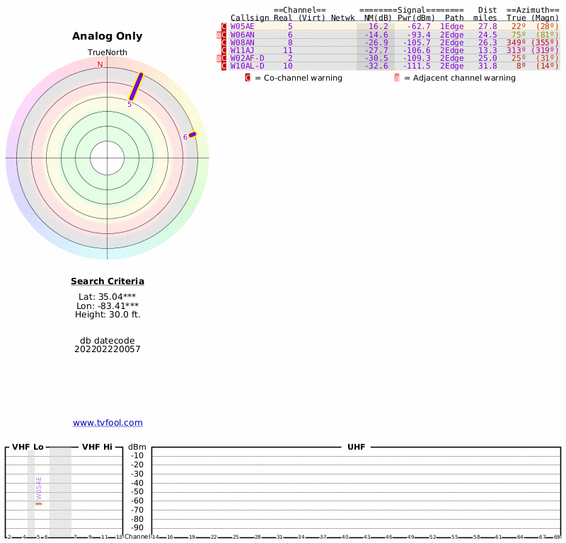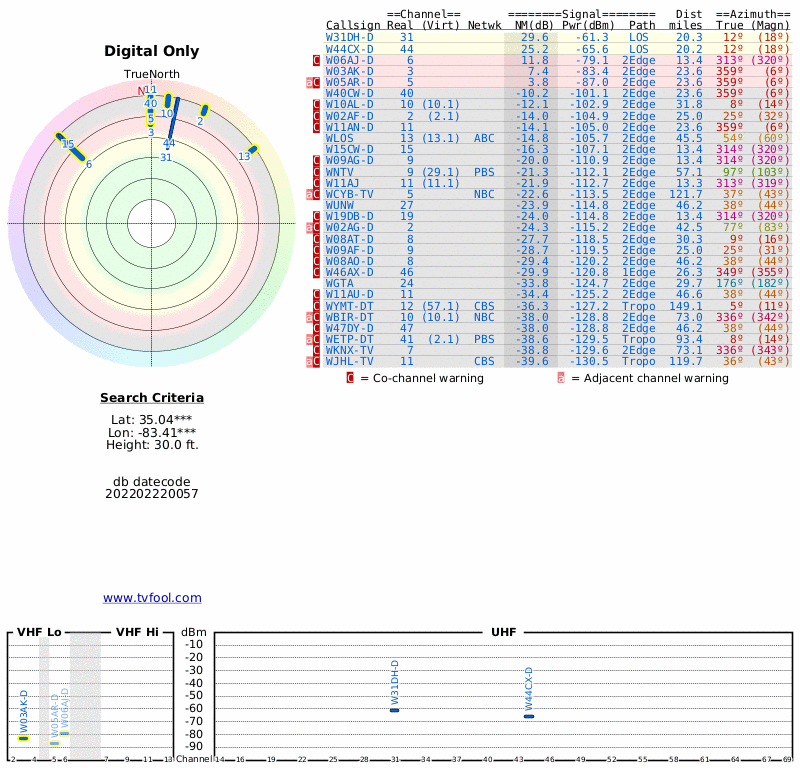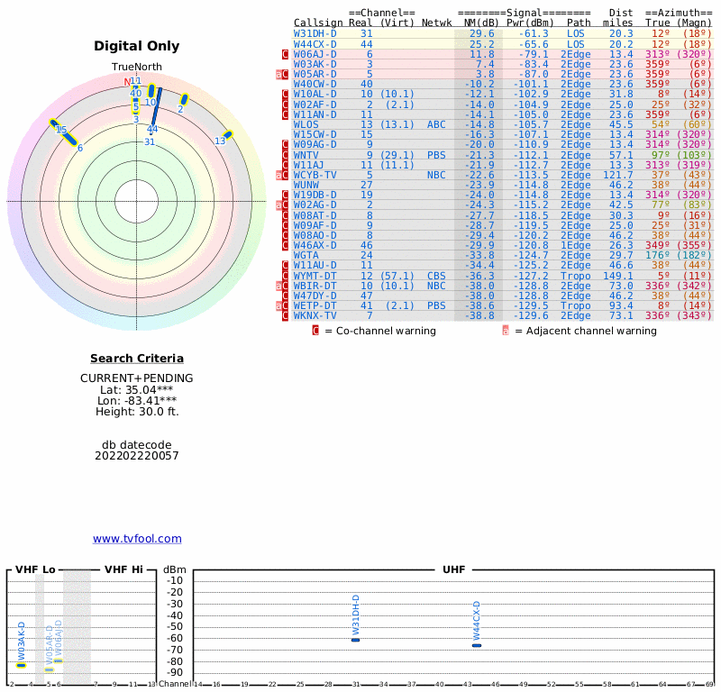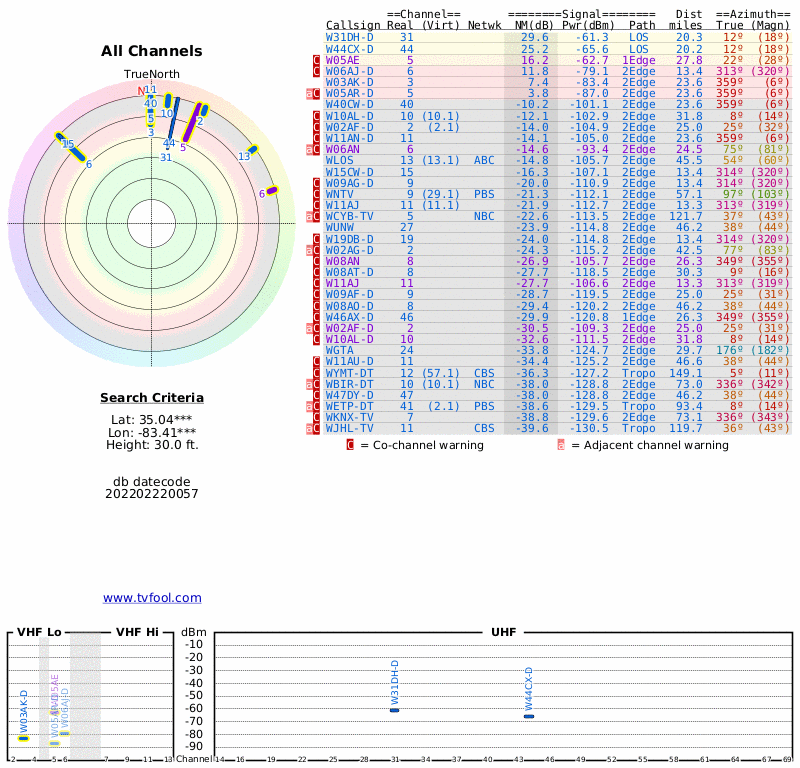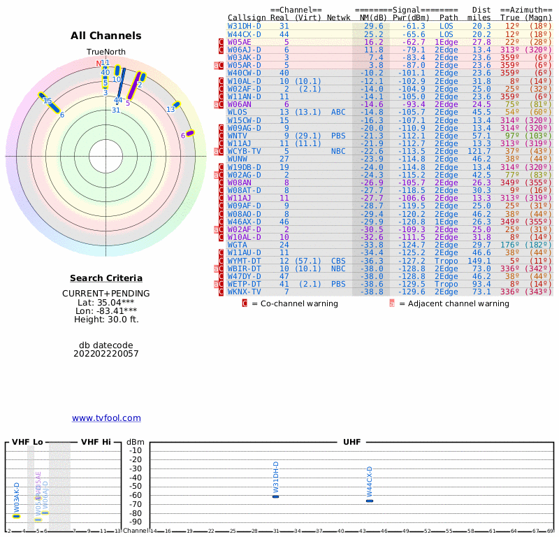 Here are the results for your location. The transmitter database was last updated on July 24, 2017. For more information about these plots and how to interpret them, please check out the Signal Analysis FAQ.