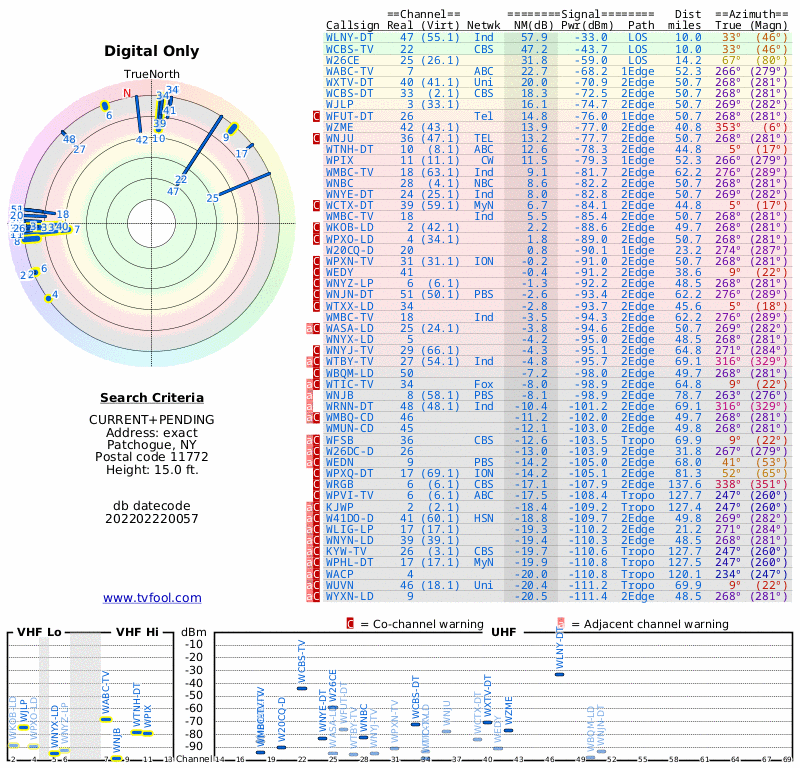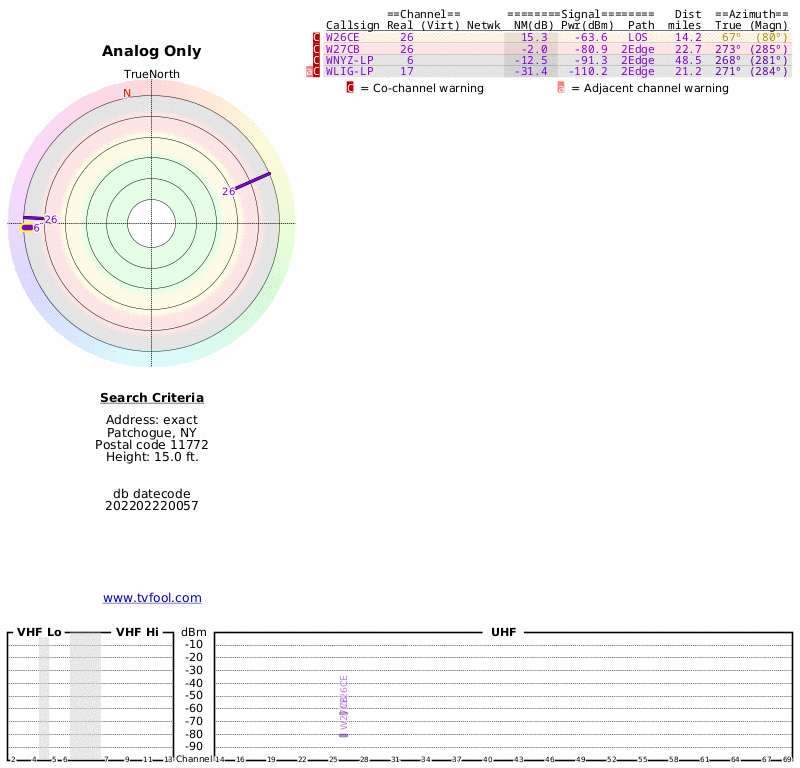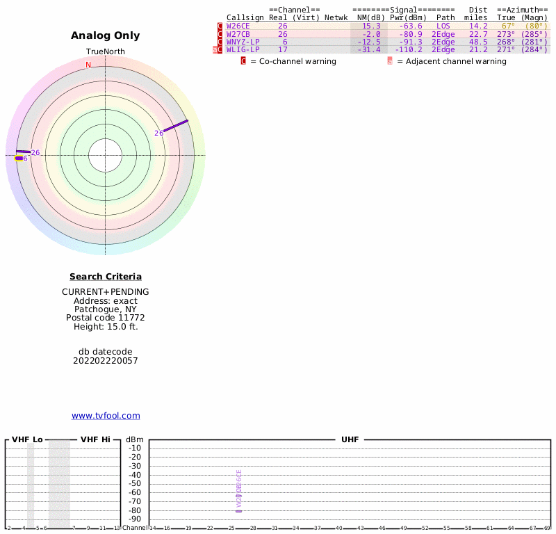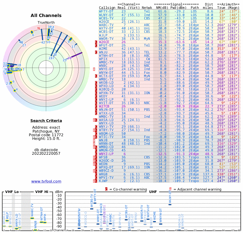 Here are the results for your location. The transmitter database was last updated on July 24, 2017. For more information about these plots and how to interpret them, please check out the Signal Analysis FAQ.