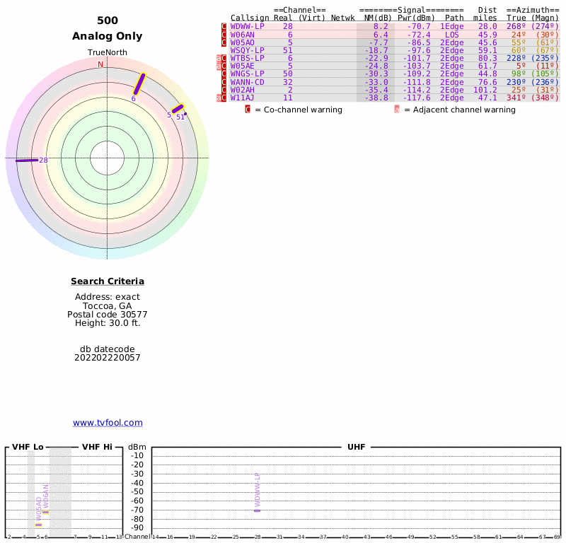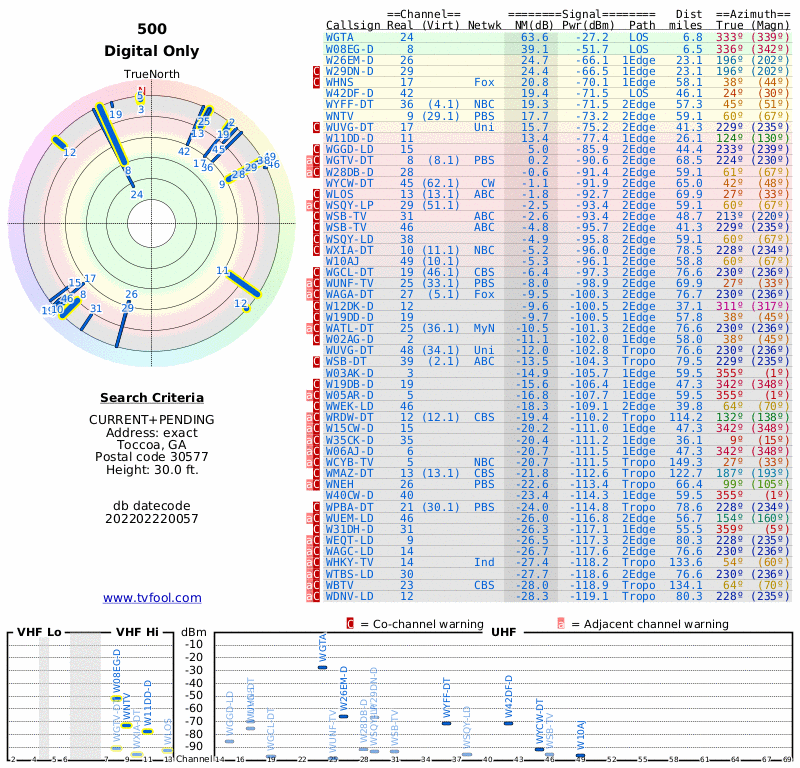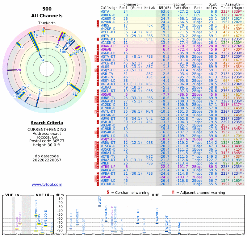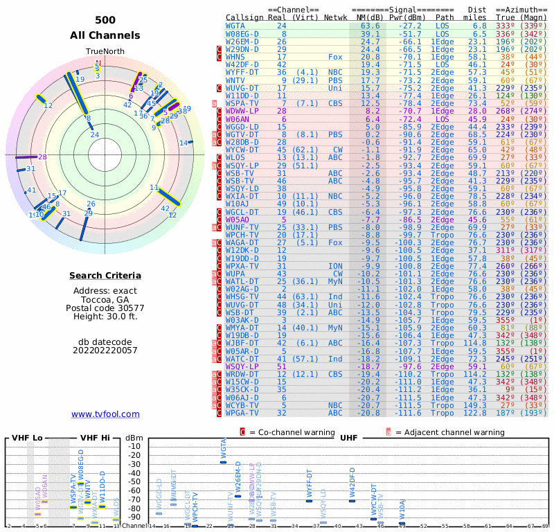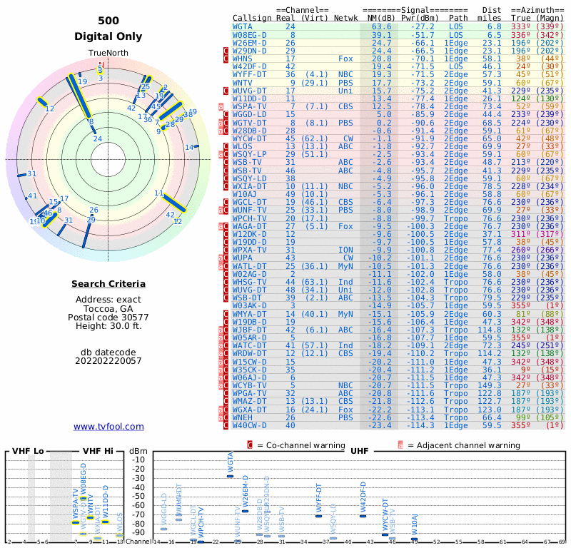 Here are the results for your location. The transmitter database was last updated on July 24, 2017. For more information about these plots and how to interpret them, please check out the Signal Analysis FAQ.