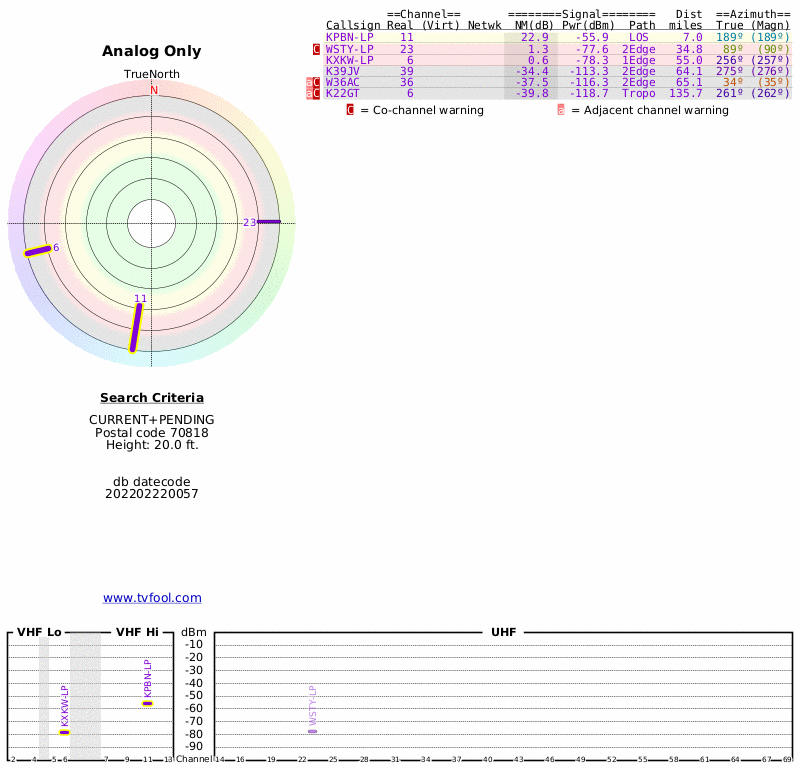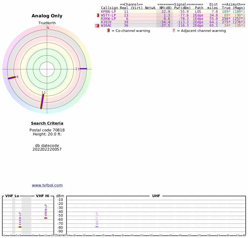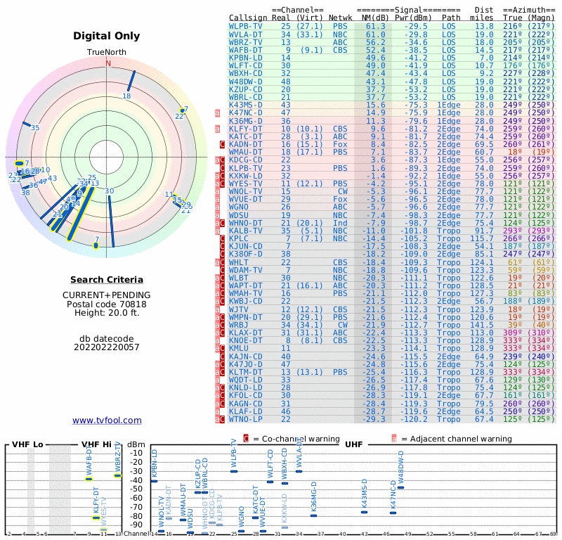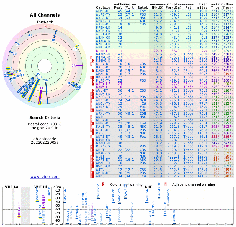 Here are the results for your location. The transmitter database was last updated on July 24, 2017. For more information about these plots and how to interpret them, please check out the Signal Analysis FAQ.
