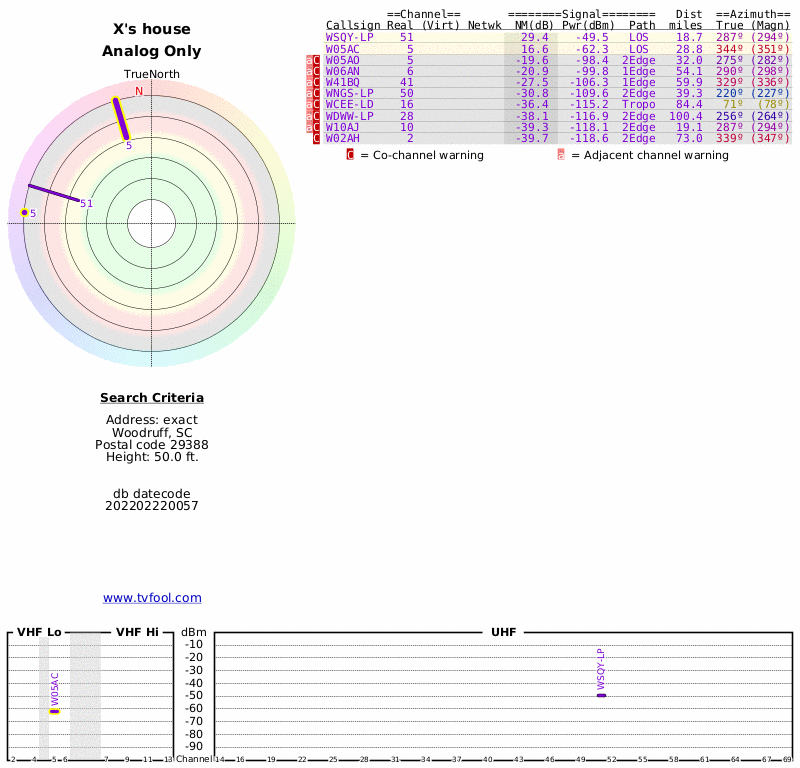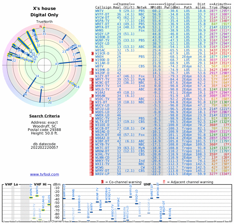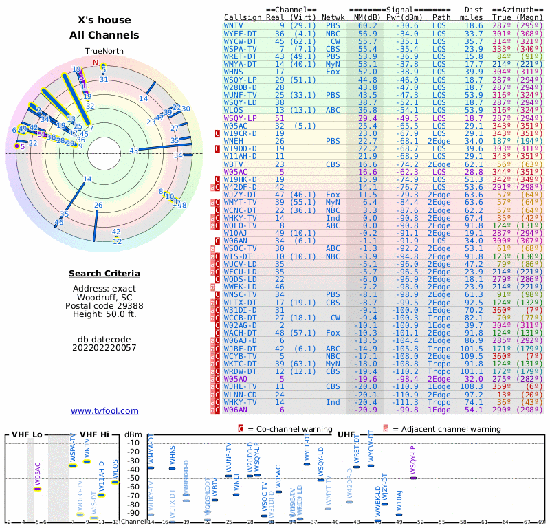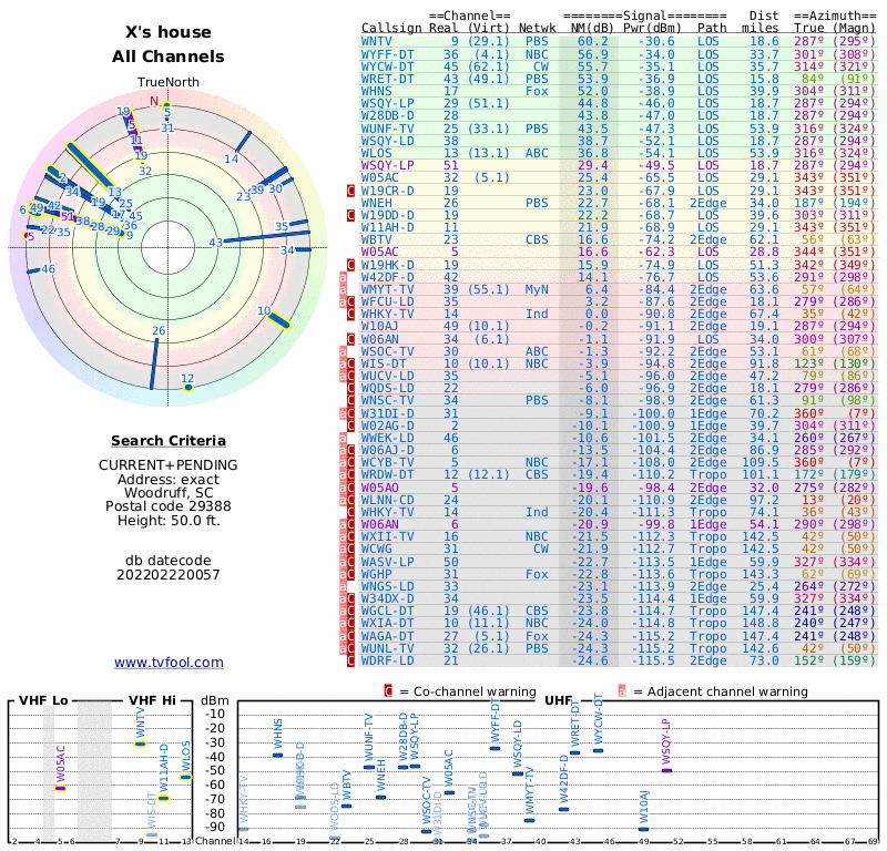 Here are the results for your location. The transmitter database was last updated on July 24, 2017. For more information about these plots and how to interpret them, please check out the Signal Analysis FAQ.
