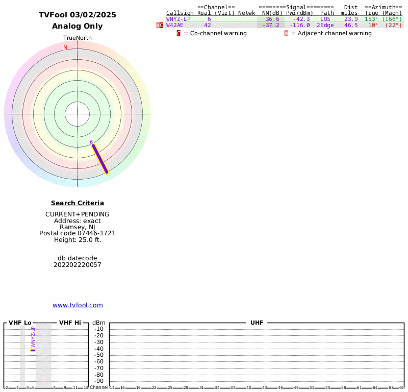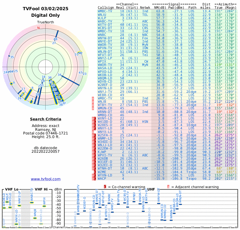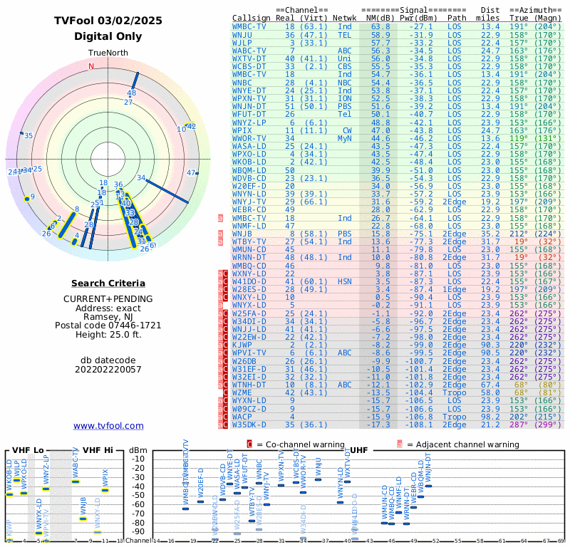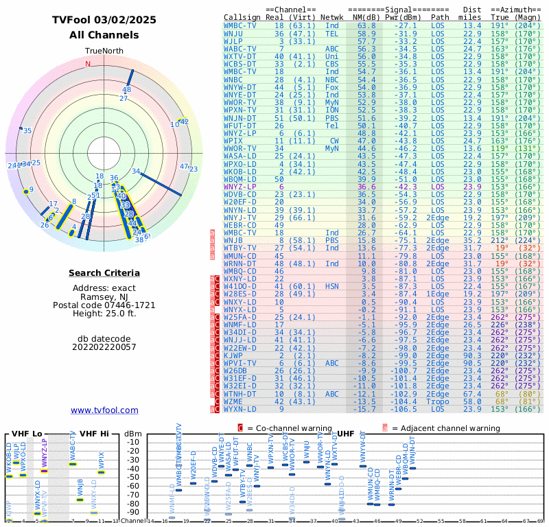Here are the results for your location. The transmitter database was last updated on July 24, 2017. For more information about these plots and how to interpret them, please check out the Signal Analysis FAQ.