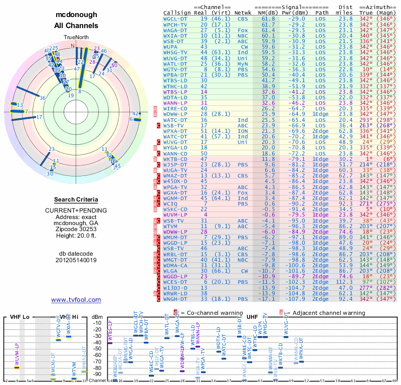 Here are the results for your location. The transmitter database was last updated on June 7, 2013. For more information about these plots and how to interpret them, please check out the Signal Analysis FAQ.