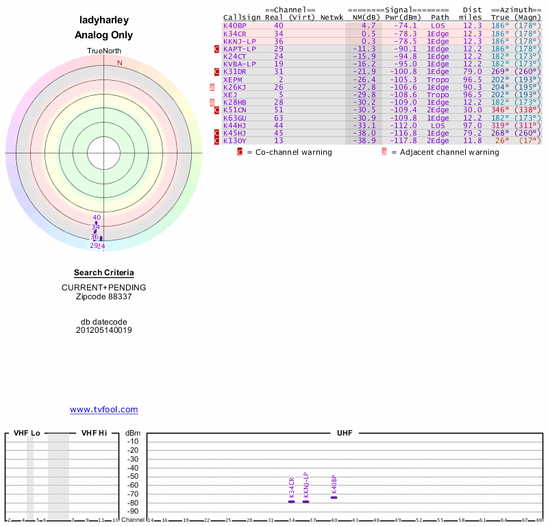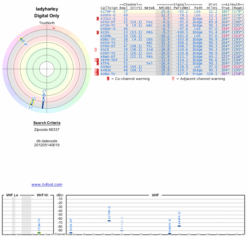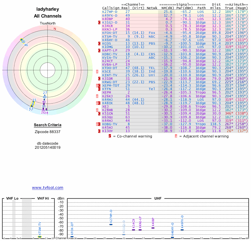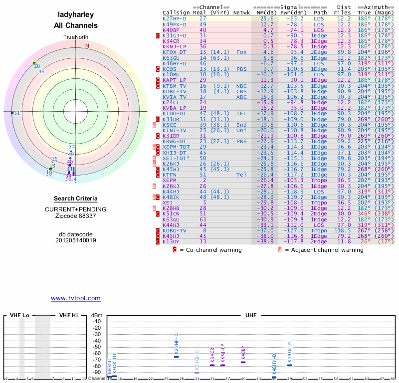 Here are the results for your location. The transmitter database was last updated on June 7, 2013. For more information about these plots and how to interpret them, please check out the Signal Analysis FAQ.