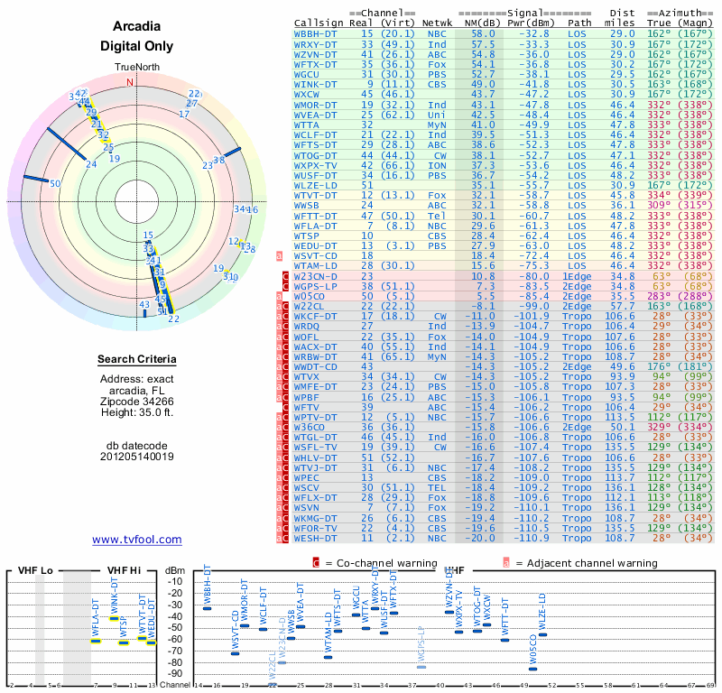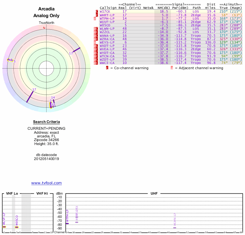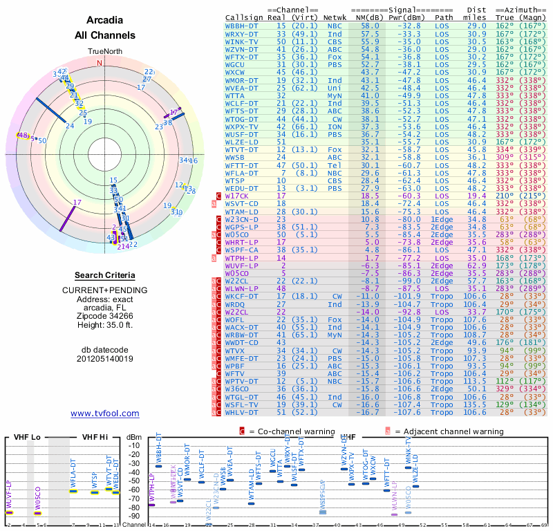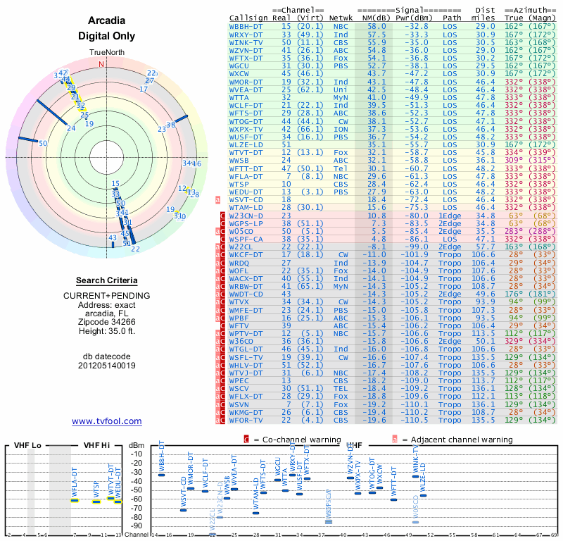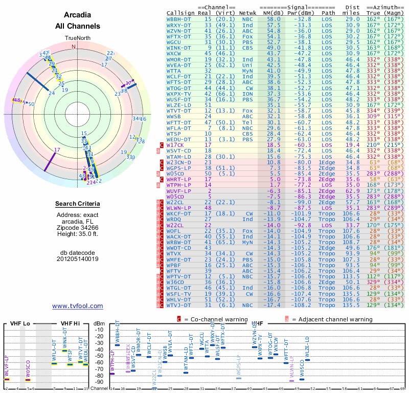 Here are the results for your location. The transmitter database was last updated on June 7, 2013. For more information about these plots and how to interpret them, please check out the Signal Analysis FAQ.