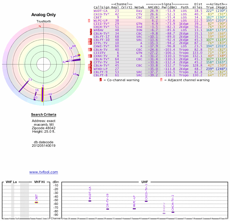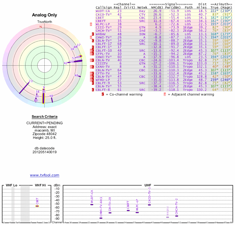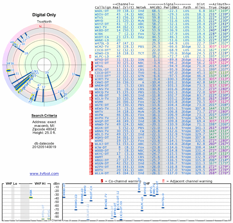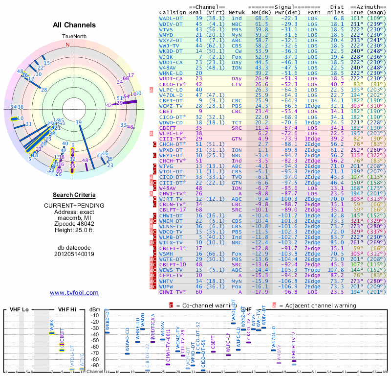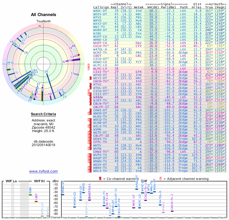 Here are the results for your location. The transmitter database was last updated on June 7, 2013. For more information about these plots and how to interpret them, please check out the Signal Analysis FAQ.