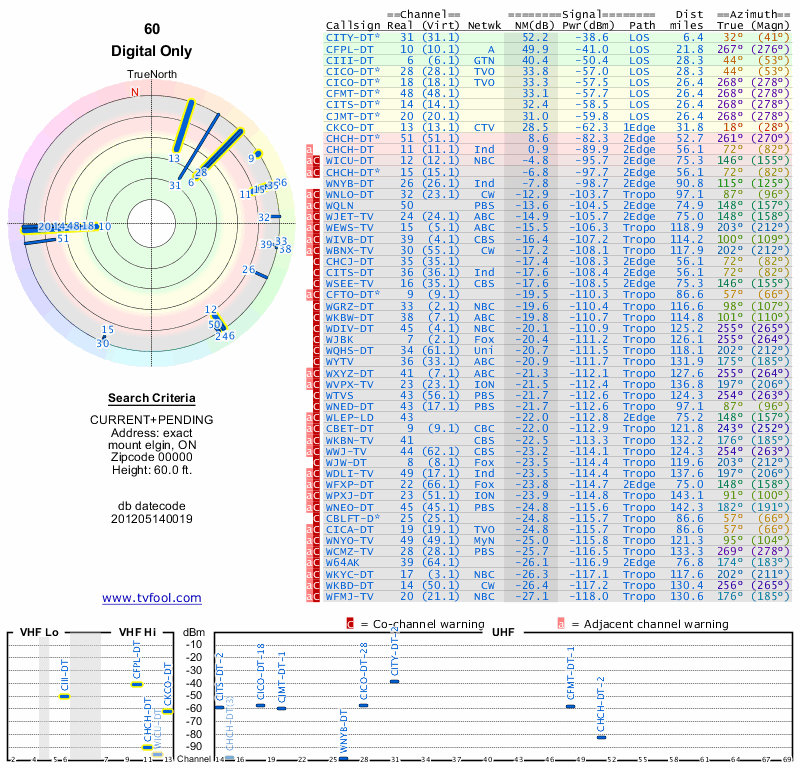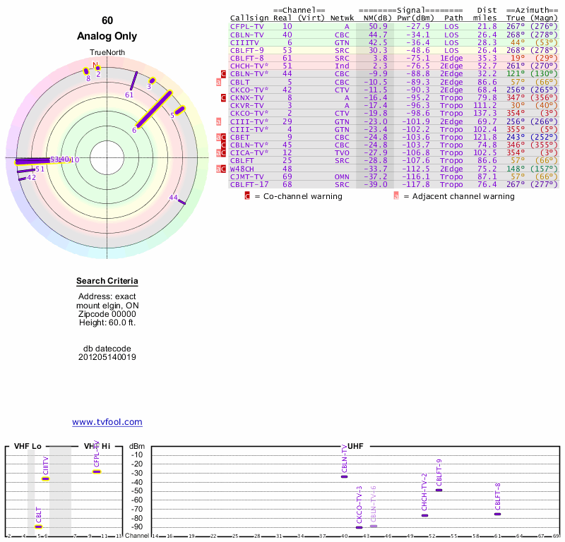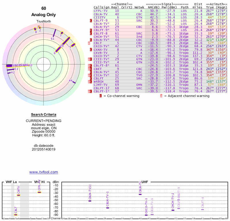 Here are the results for your location. The transmitter database was last updated on June 7, 2013. For more information about these plots and how to interpret them, please check out the Signal Analysis FAQ.