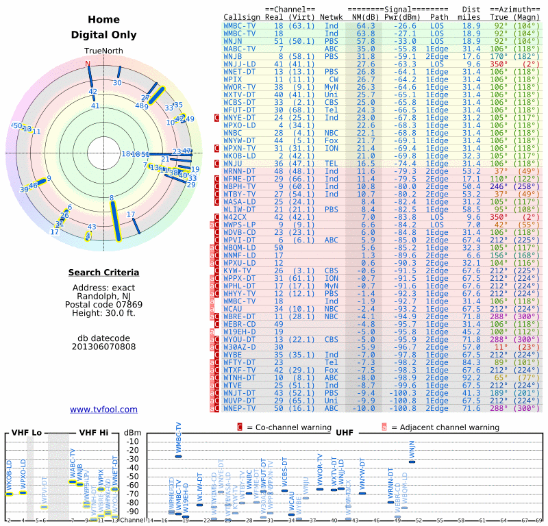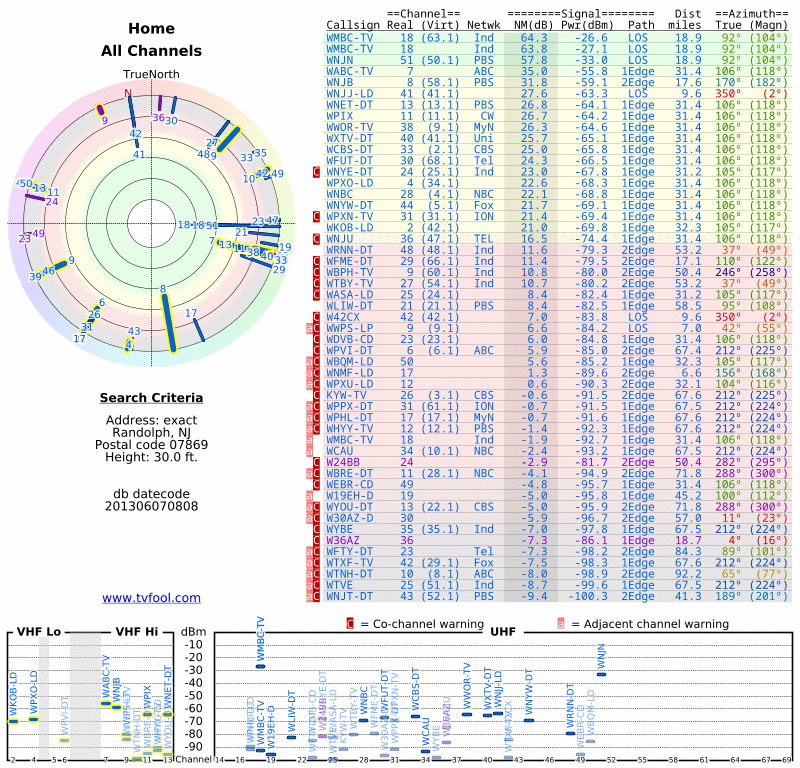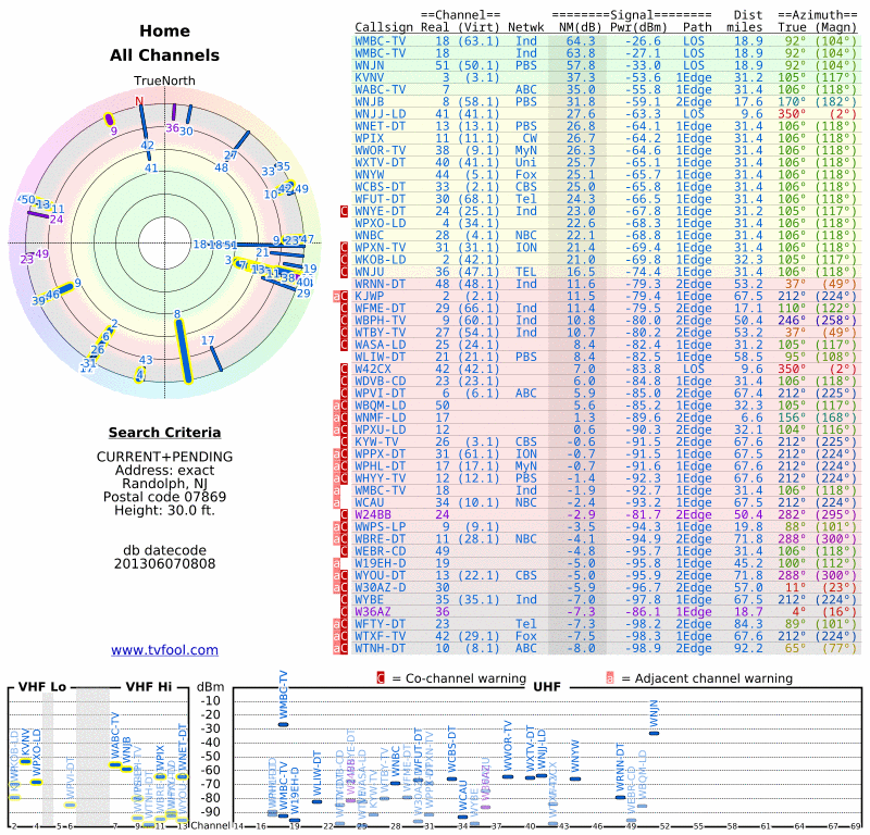 Here are the results for your location. The transmitter database was last updated on June 7, 2013. For more information about these plots and how to interpret them, please check out the Signal Analysis FAQ.