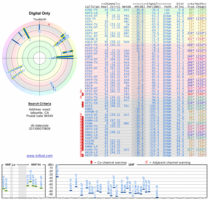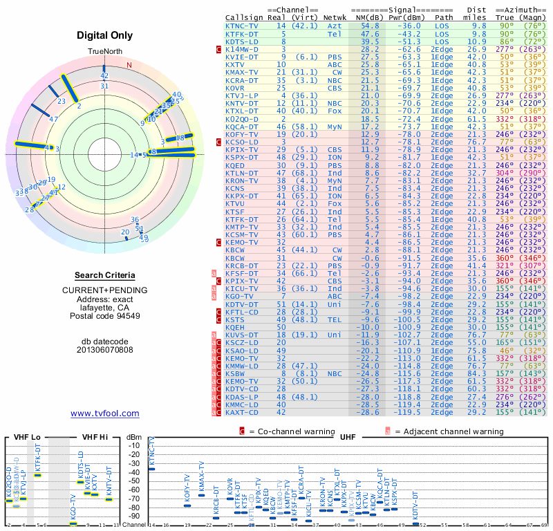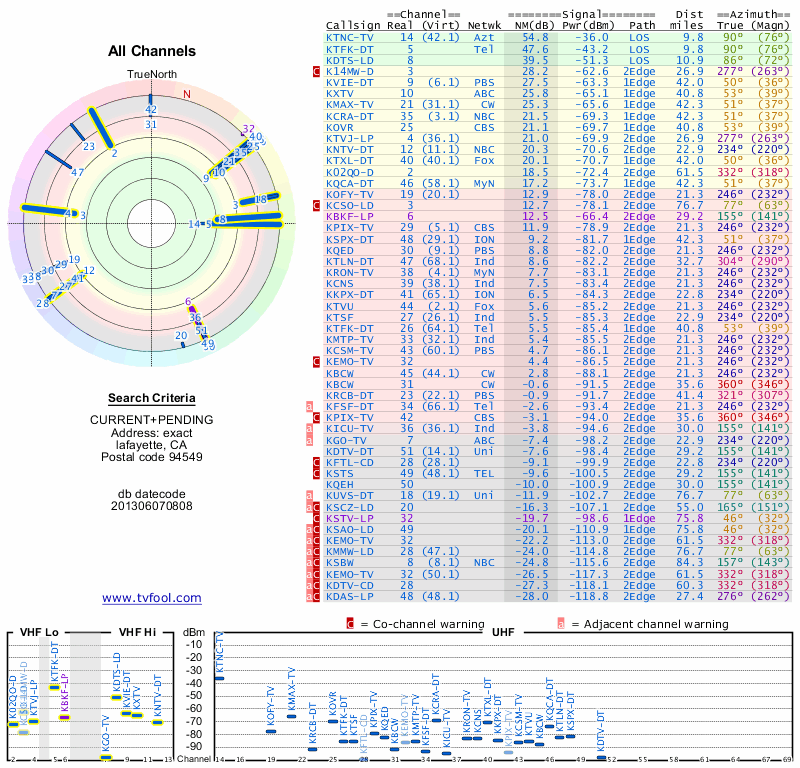 Here are the results for your location. The transmitter database was last updated on June 7, 2013. For more information about these plots and how to interpret them, please check out the Signal Analysis FAQ.